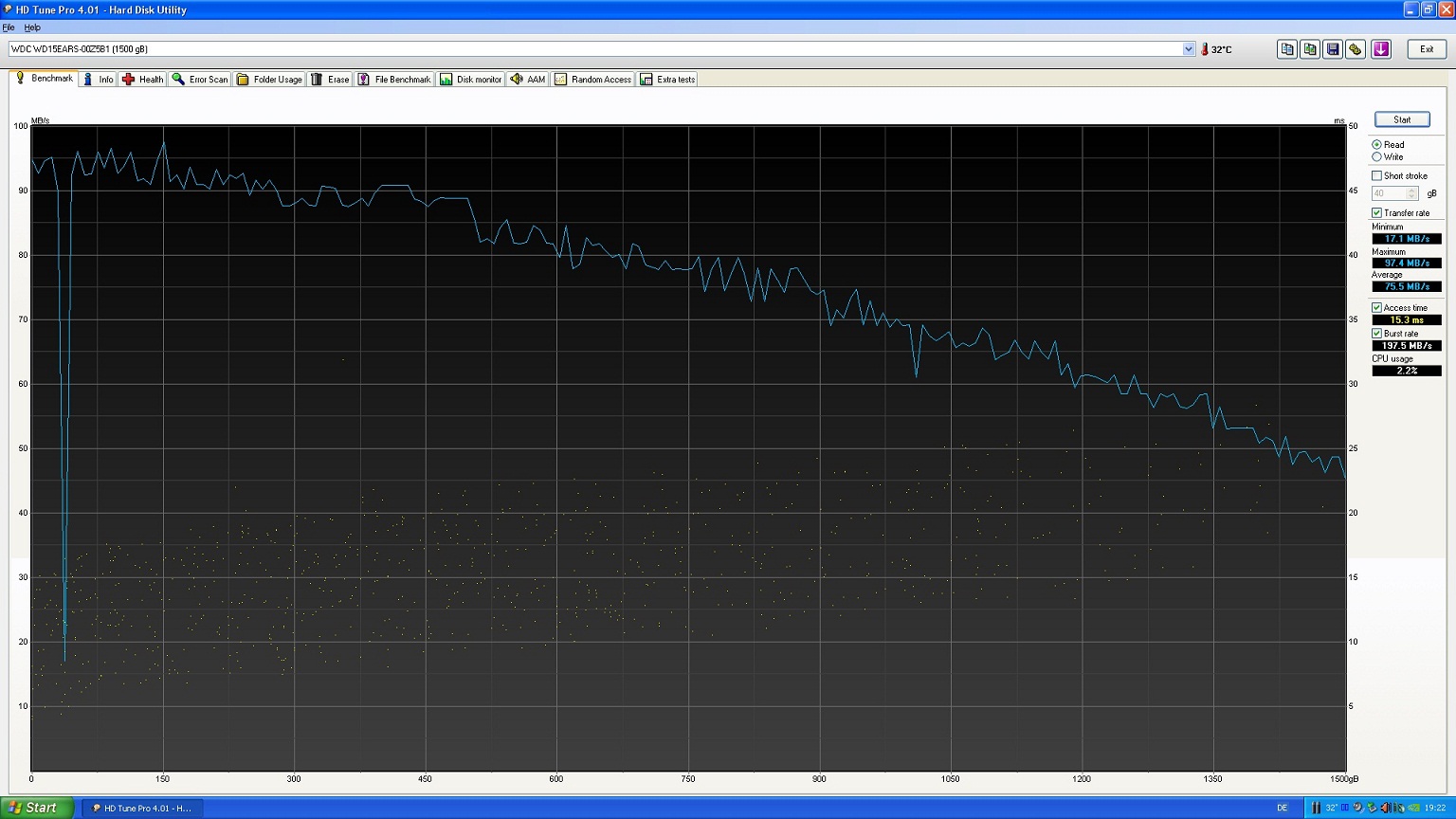 Hab jetz nich so die Erfahrung mit HD Tune, aber sowas hab ich bei mir noch net gesehn. Programm war keins aktiv was das hätte verursachen können. Is ja auch komisch dass es nur an dieser einen Stelle ist.