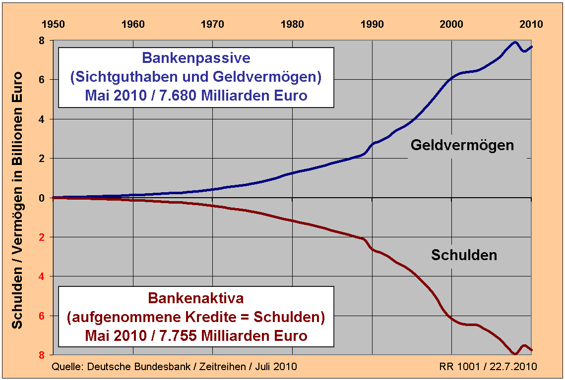 zum irtum nummer 2 der verteidiger "es entsteht kein geld denn wenn die schulden zurück gezahlt werden verschwindet sowohl schuld als auch geld also verlängert man nur die billianz". ja das mag stimmen wenn das system so funktioniert person a borgt sich bei b geld aus und zahlt es dann wieder zurück. so ist es aber nicht. es werden firmen und länder dauerhaft auf kredit gehalten, diese geben dann wieder kredite weiter und diese wieder weiter und diese geben es auf die bank und die bank gibt mit der mindestreserve 100fach mehr kredite weiter etc.. man sieht sehr gut dass sich seit 1970 die geldmenge ums xxxx fache aufgeblasen hat und zwar längeefristig NUR durch giralgeld..