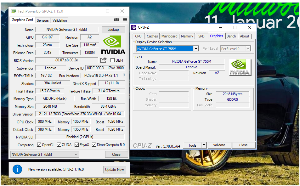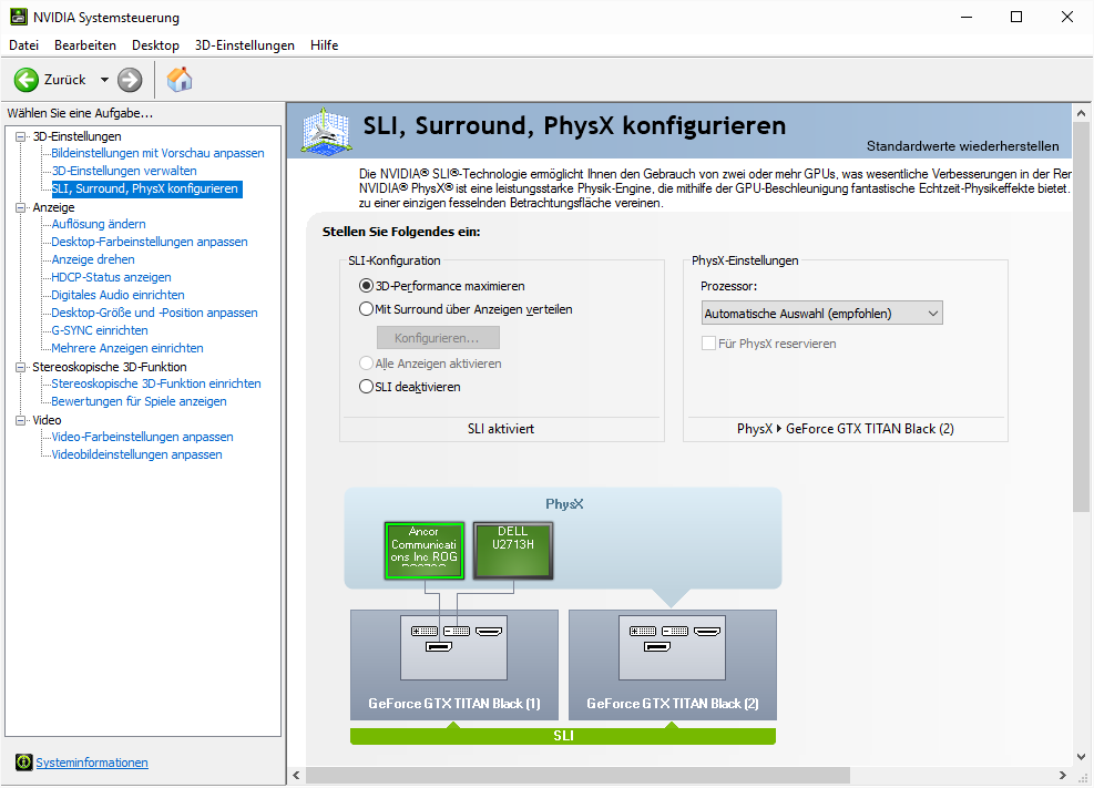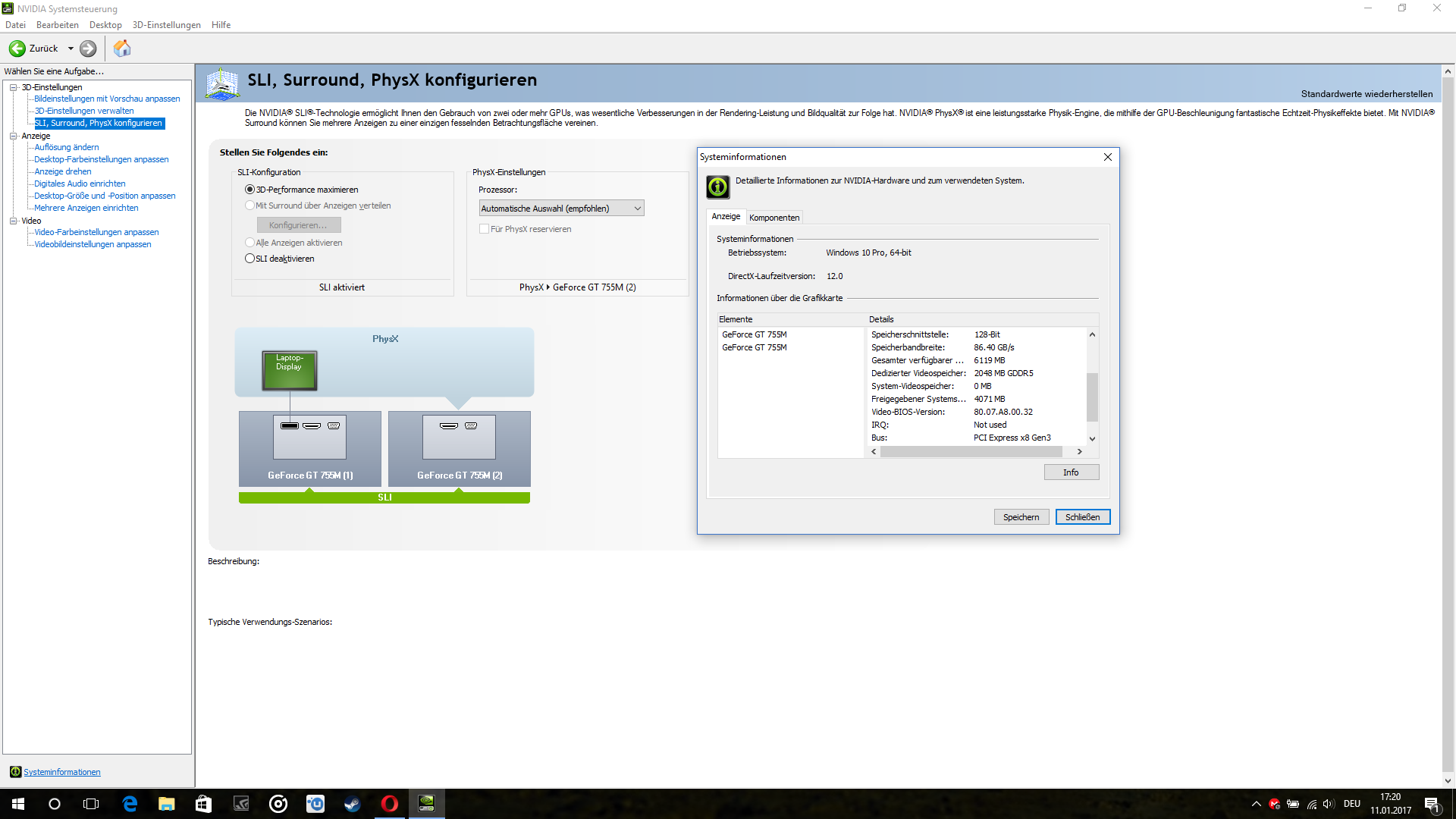 Bei NVIDIA GeForce Experience wird mir angezeigt das zwei GT 755M eingebaut sind und es ist auf maximale 3D-Performance gestellt. Bei GPU-Z werden mir ebenfalls beide Grafikkarten angezeigt. (Ich kann über einen Reiter zwischen den zwei Grafikkarten wählen.)