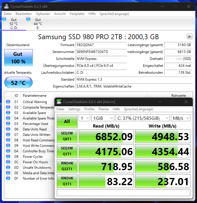 Immer wieder interessant diese Werte, auch wenn man sich bei diesen Tools keinen großen Kopf machen sollte. Bei meiner gerade verbauten Crucial T700 sieht das so aus: