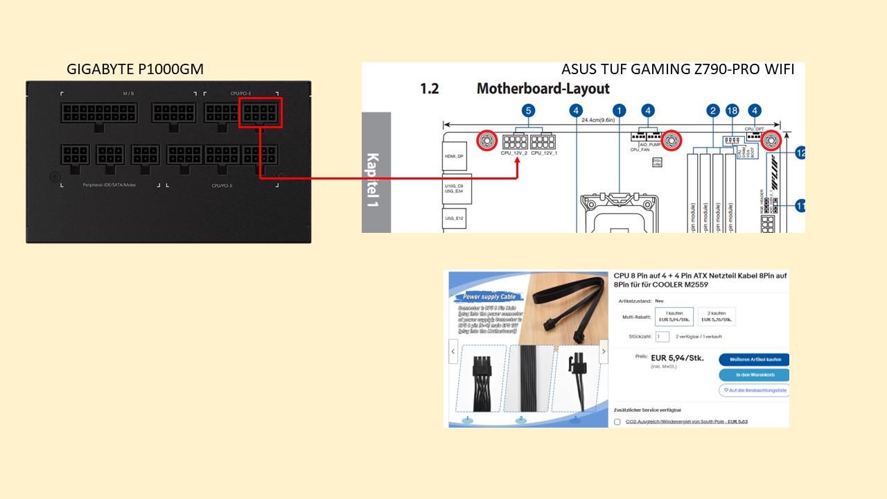 Hintergrund ist folgender: Der Arbeitsspeicher ist für XMP ausgelegt, wenn ich im UEFI/BIOS XMP aktiviere (es wird dann auch richtig 7200 erkannt) bootet der Rechner nicht mehr (nur mit 1x 8PIN Stromversorgung). Nach Recherche im Internet, bin ich öfters auf den Hinweis gestossen, dass für eine Übertaktung zwingend das 2.te Kabel benötigt wird. Das NT sollte mit 1000W auch stark genung sein und Kabelsteckplätze sind genug vorhanden.