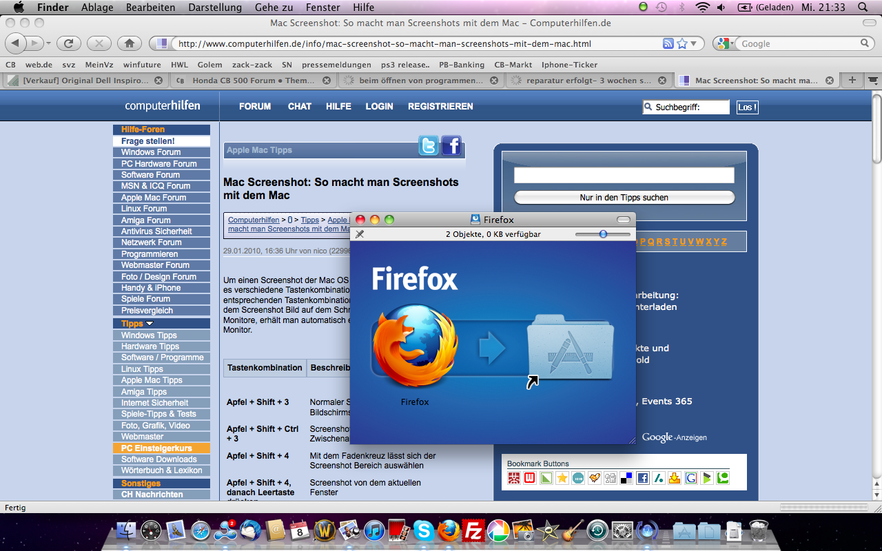 beispiel firefox.installation soweit ohne probleme,aber jedes mal wenn dieser komplett beendet war(also kein blauer punkt unter dem firefox symbol im dock) und ich firefox nun wieder öffnen möchte, öffnet sich ein fenster mit. da steht dann "firefox" hinterlegt mit dem firefox logo und rechts daneben steht "applications" mit einem ordner symbol unterlegt. vom firefox symbol zum ordner symbol zeigt ein feil.