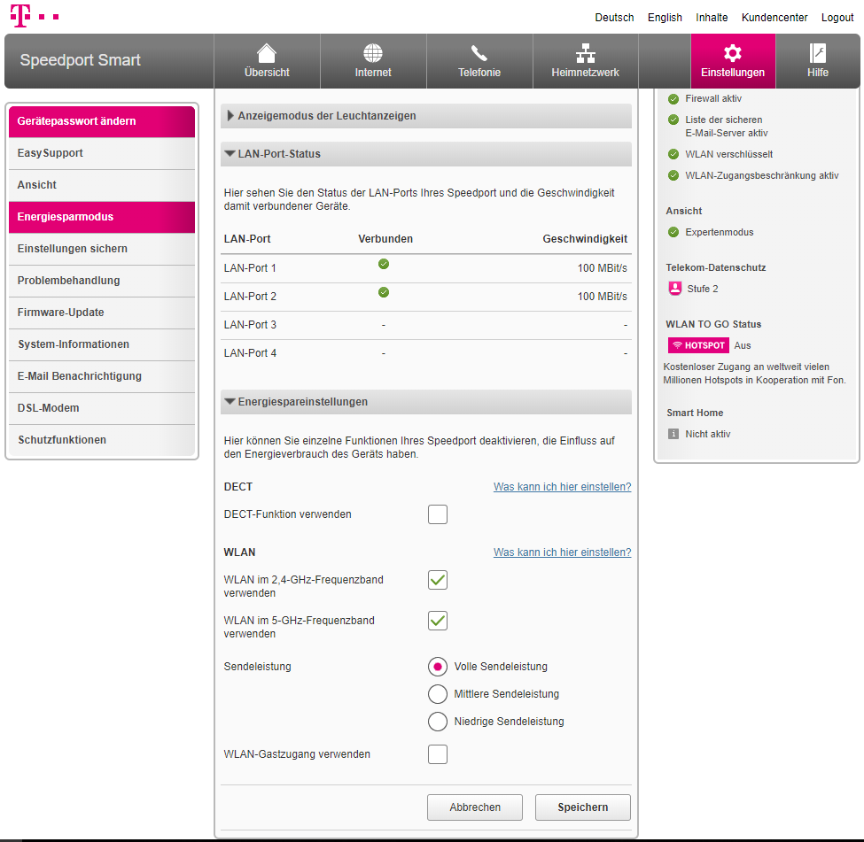 Das Glasfaser-Modem zum Router (neuer Telekom Speedport Smart) ist über CAT 7 und vom Router zum Verteiler und dann von der LAN-Buchse zum PC über CAT 6 angeschlossen. Meine Netzwerkkarte, bzw. das Netwerk-Interface ist Intel Ethernet Connection 1219-V, was 1 Gbit/s (1000Base-T) anscheinend kann.