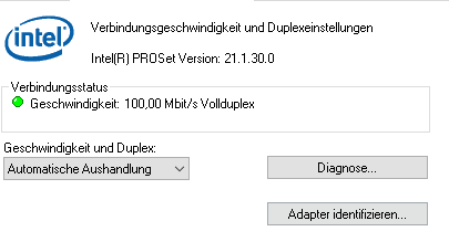 Dort zeigt es mir nur 100 Mbit/s an. Manuell kann ich es zwar auf 1 Gbit/s stellen, dann habe ich aber keine Verbindung.