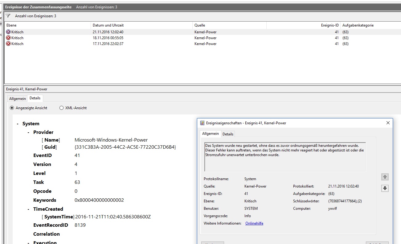 Ein Blick in die Ereignisanzeige offenbarte dann innerhalb der letzten 7 Tage 3 kritische Ereignisse mit einem unerwarteten Reboot des Systems; das Zeitfenster passt mit dem Einbau der RAM-Riegel und oben beschriebenen Fauxpas.