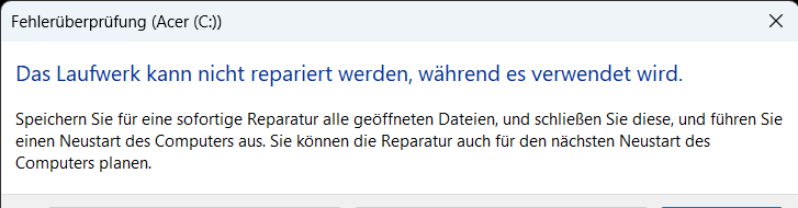 dass der PC neu gestartet werden soll um das Laufwerk zu reparieren.