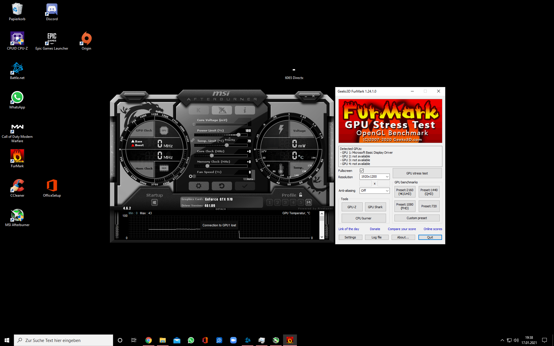 Einmal hatte nach versuchtem Warzone-Start die Verbindung zur GraKa sich verabschiedet, wie MSI und Furmark mir mitteilten (Screenshot).