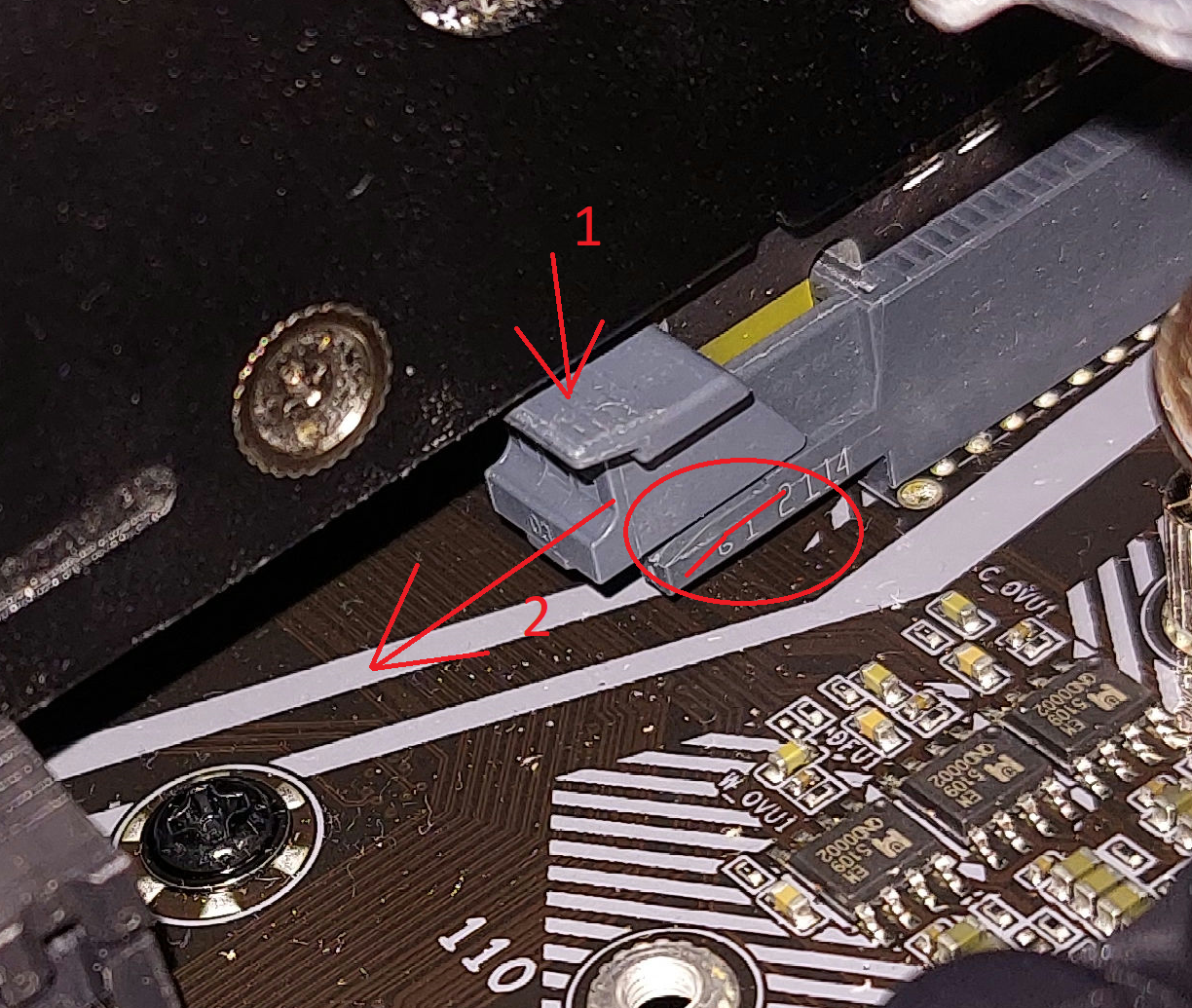Das Problem ist ja nur sein Slot hat ne andere Arrietierung, als auf dem GB Foto oder dem Video, wenn ich mir die genauer angucke dann geht es trotzdem mit oben druf drücken -vorausgesetzt die Karte sitzt überhaupt richtig im Slot. Entweder oben drauf wie in 1 oder Möglichkeit 2, man sieht ja der kippt auch nach hinten ab daher gehe ich von 1 aus... Man sieht ja leider keinen Hersteller auf dem Slot