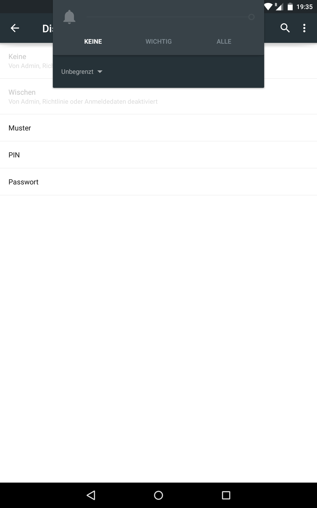 die optionspunke "keine" bzw. "wischen" in den einstellungen sicherheit --> displaysperre lassen sich nicht auswählen und sind ausgegraut (siehe screenshot), den rest kann ich nach belieben ändern.