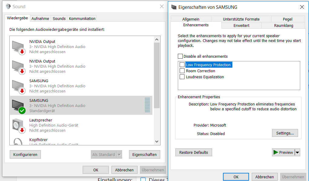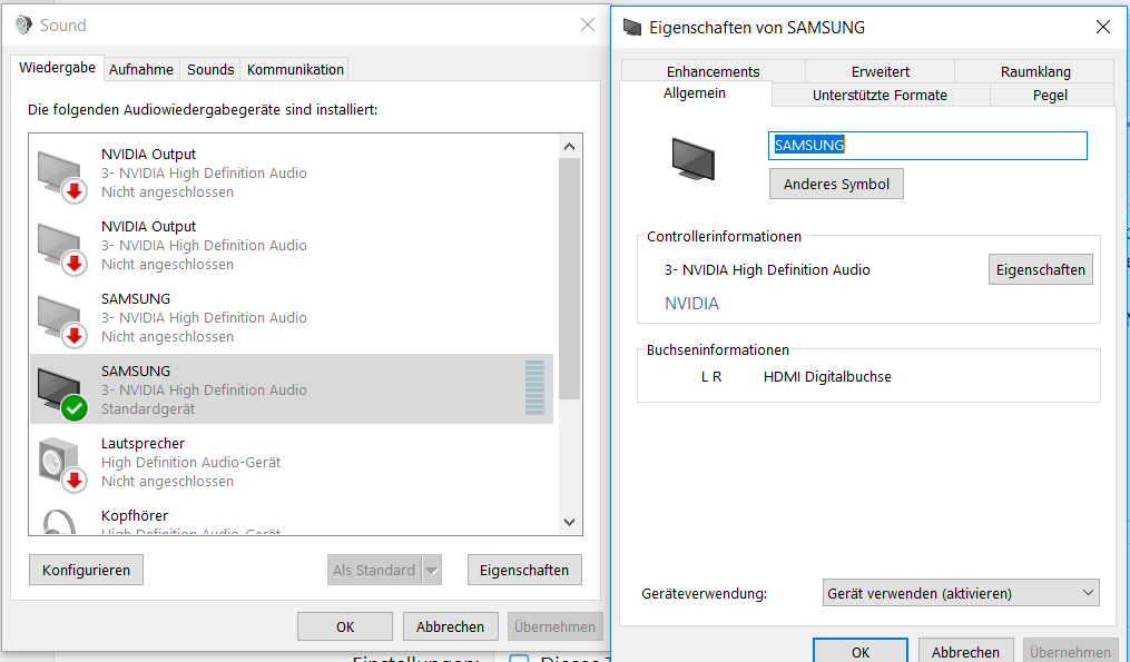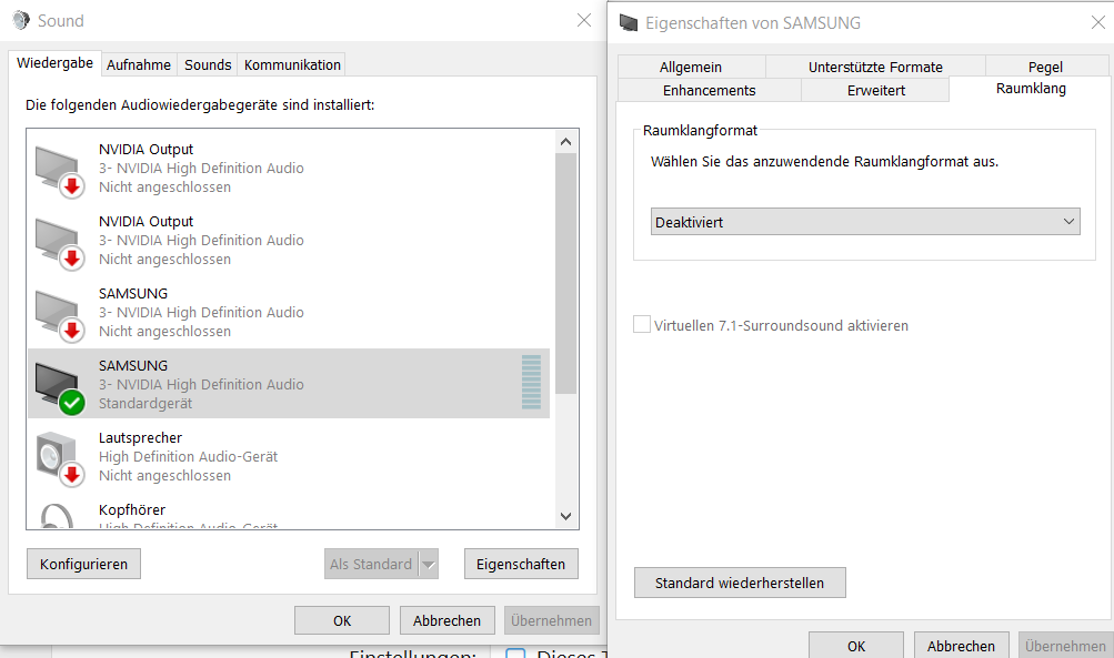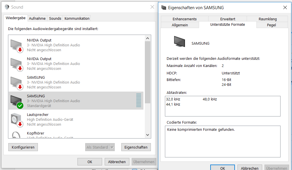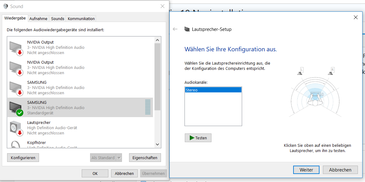 Jetzt wollten wir ein Film gucken 1080p DTS und da fiel mir auf im VLC Player damit ich nur Stereo auswählen kann. Also mal bei Windows bisschen geguckt und auch dort, nur Stereo verfügbar. Rechtsklick auf das Lautsprechersymbol unten rechts (von Windows) , Lautsprechereinrichtung. Dort kann ich nur Stereo auswählen, 5,1 und 7,1 sind grau hinterlegt.