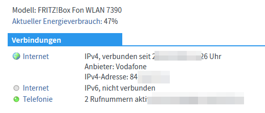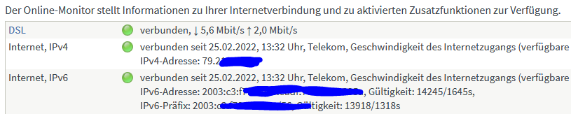 Habe eine Fritzbox 7490 am Telekom DSL-Anschluss. In der Oberfläche der Fritzbox wird mir angezeigt, dass diese mit einer IPv4 und einer IPv6 Adresse verbunden ist.