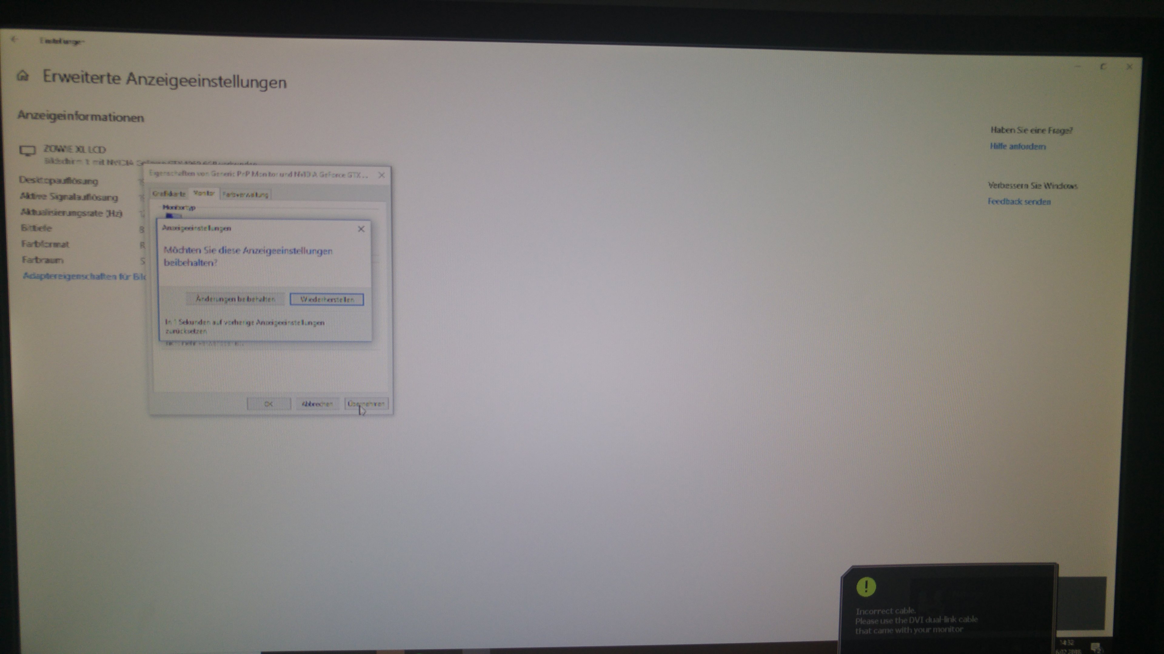 Habe mir also vor einiger Zeit den genannten Monitor gebraucht gekauft, dazu ein DVI Dual Link Kabel um ihn auf 144hz an meiner Zotac Gtx1060 laufen zu lassen. Jedes mal, wenn ich nun mehr als 60hz auswähle, bekomme ich vom Monitor eine Meldung: "Incorrect Cable, please use the Dvi Dual Link cable that came with your monitor", und der Bildschirm wird verzerrt und die Auflösung wird komisch. Habe inzwischen 3 Dvi Kabel, weil ich in englischen Foren gelesen habe, dass es mit einem neuen Kabel geklappt hat. Habe auch viele andere Sachen ausprobiert, bin mir nun ziemlich sicher, dass der Fehler beim Monitor, beim Kabel oder bei irgendwelchen Treibern liegt. Habe aber inzwischen gar keine Ideen mehr was ich noch versuchen kann. Vielleicht könnt ihr mir ja helfen. Mfg