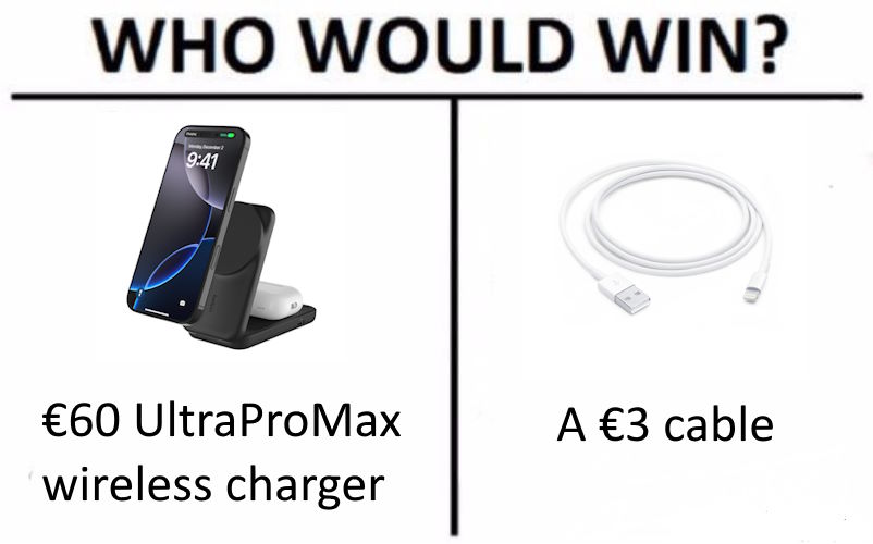 Wenn man also drei Geräte gleichzeitig mit 25 Watt drahtlos laden will, benötigt man locker ein 100 Watt-Netzteil. Da haben sie mal wieder an der falschen Stelle gespart.