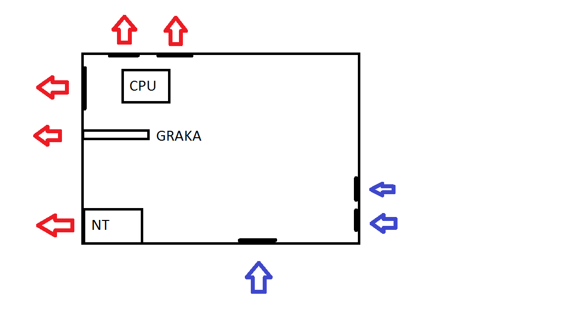 da ich ja ganz gerne an meinem rechner rumschraube, habe ich mich gefragt was ich noch tun könnte. aufgrund der etlichen verbauten Lüfter dachte ich man könnte vllt das belüftungskonzept verbessern. ich hab gerade mal i paint ne zeichnung gemacht wie es im moment aussieht. dabei hab ich mich dann 2 sachen gefragt: