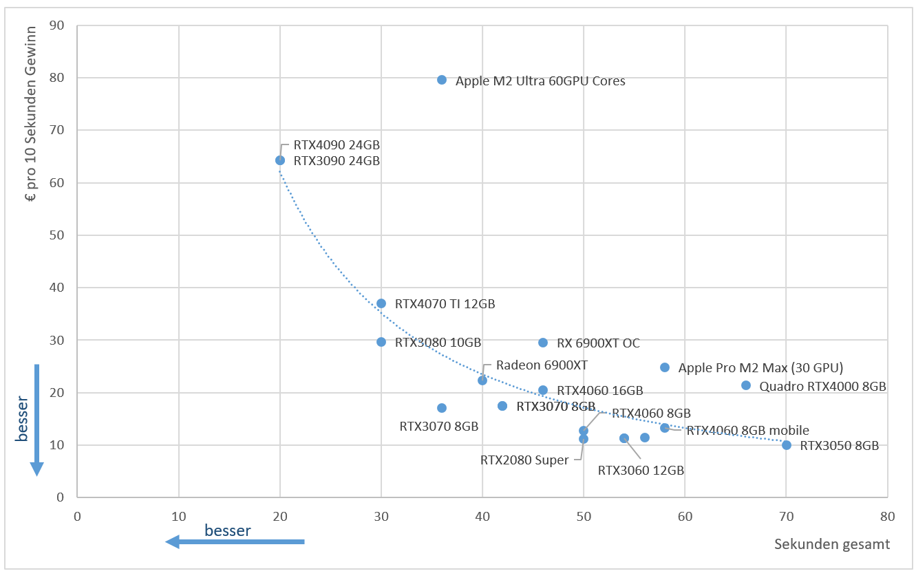 Kalkuliert habe ich Preis/Leistung als den €-Betrag, den man jeweils pro 10 gewonnener Sekunden zu einer iGPU investieren muss: