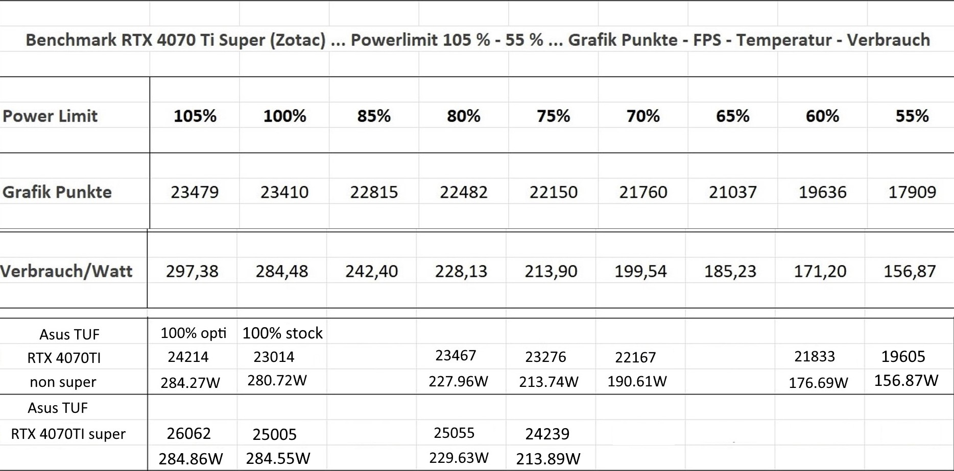 Die Wattangaben sind die Höchstwerte. Die geglätteten Kurven lag im Schnitt etwas darunter. Daher auch die Wahl des 82% PL für den Gegentest. Aber auch in dem Benchmark war stellenweise niedriger unterwegs.