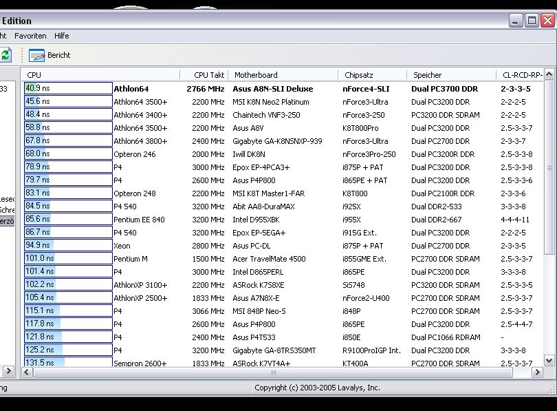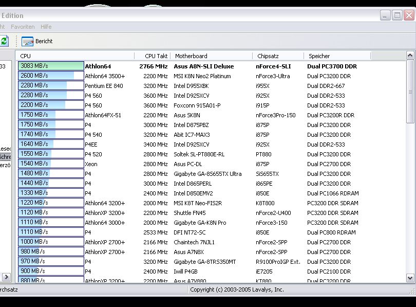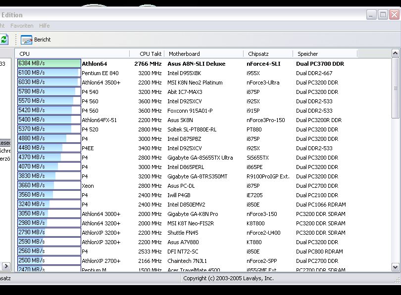 meine Kiste hatte letztes Mal glaub ich n schlechten Tag, hab noch ma durchlaufenlassen, jetzt sind die Werte für meinen Rechner (siehe Sig) schon eher im Rahmen: