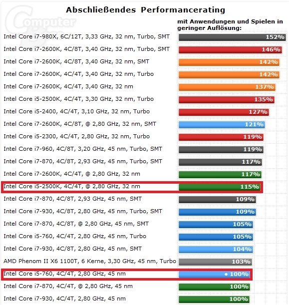 Zumal der 2500(k) preislich Anfangs etwas über dem i5-750/760 war. Wenn wir den preislich ähnlichen 2400 oder einen der 2300er nehmen ist das Taktpgrade mit maximal ~10% auch nicht gerade groß. (2.8GHz auf 3.0/3.1GHz)