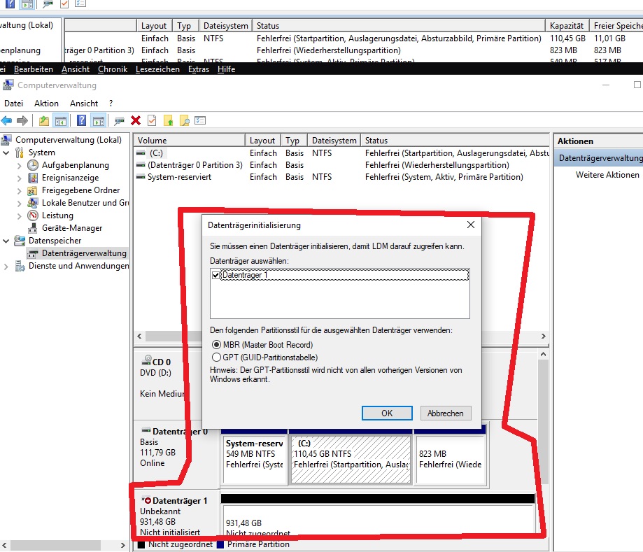 Und jetzt das eigentliche dramatische Problem: Während des ganzen Vorgangs war meine ext. Musik-HDD noch angeschlossen. Ich kann mir überhaupt nicht erklären wie das nun passiert ist aber seitdem wird die HDD nicht mehr im Win-Explorer angezeigt 😥 Also habe ich die Datenträgerverwaltung geöffnet und dort erscheint sie als "Datenträger 1" nicht zugeordnet (kein Dateisystem). Dann habe ich sie nochmal abgeklemmt und einen anderen USB-Port ausprobiert. Sobals ich dann die Datenträgerverwaltung öffne erscheint dieses popup in dem ich zwischen MBR oder GPT auswählen kann. Weitere Schritte unterlasse ich ab hier und verlasse mich auf eure Unterstützung. Ich werde nämlich gerade leicht panisch und bekomme Herzrasen! 😵
