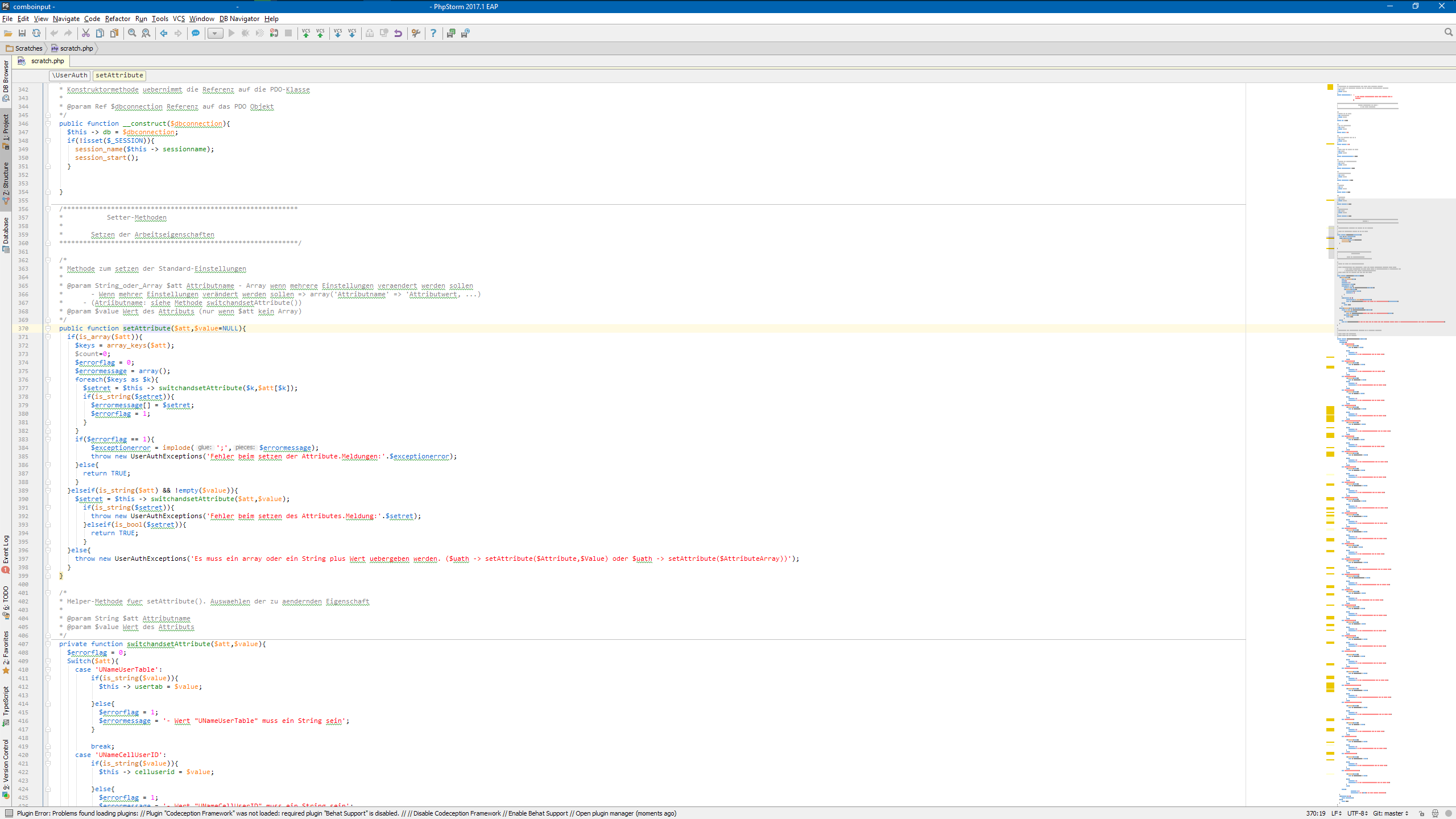 Auch einige deiner Methoden sind extrem lang, z.B. switchandsetAttribute (~ 270 Zeilen), setSessionLoggedIn (~130 Zeilen) usw. Meine Faustregel hier ist: 10 Zeilen für eine Methode sind super, 20 sind ok, 30 schon viel, und sobald ich sie nicht mehr ohne Scrollen überblicken kann, ist sie definitiv zu lang. Um dem entgegenzuwirken, kannst du lange Methoden in mehrere kürzere aufteilen. Gib ihnen sprechende Namen, und du bekommst wesentlich verständlicheren Code.