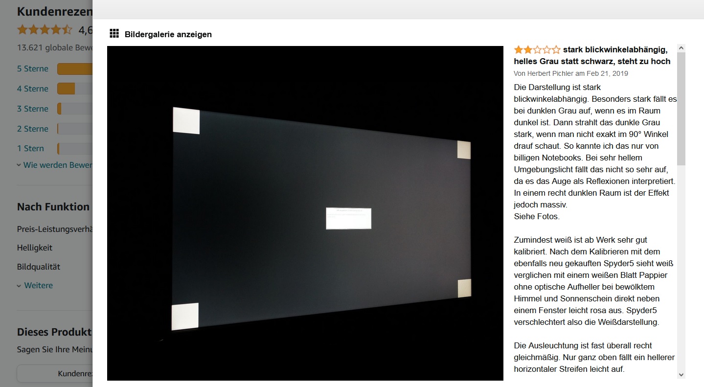 Also wenn ich direkt davor sitze (ist ja die Regel) merkt man davon gar nichts. Wenn ich aber aufstehe um was zu holen, dann sehe schon ab einem 60° Blickwinkel dieses glitzernde schwarz aber auch andere Farben. Es ist etwas verstörend, dass für die paar Schritte die man macht sich der Bildschirm so verändern kann. Wie gesagt: Falls das die Regel bei IPS sein soll, dann muss man damit leben.