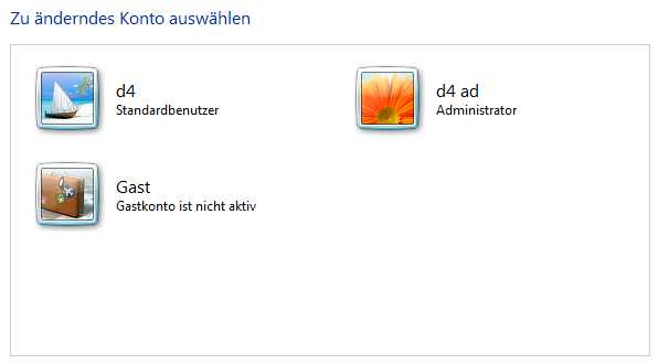 Dabei habe ich wie immer 2 Benutzerkonten eingerichtet, wobei ich das Adminkonto "d4 ad" fast nie starte (bzw ueber dessen Desktop arbeiten), sonder nur das Standardkto "d4".