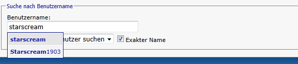 Wenn du bei der erweiterten Suche den zu suchenden Benutzernamen eingibst, werden in Echtzeit in einem kleinen Menufenster unter der Eingabe passende Nicknames angezeigt.