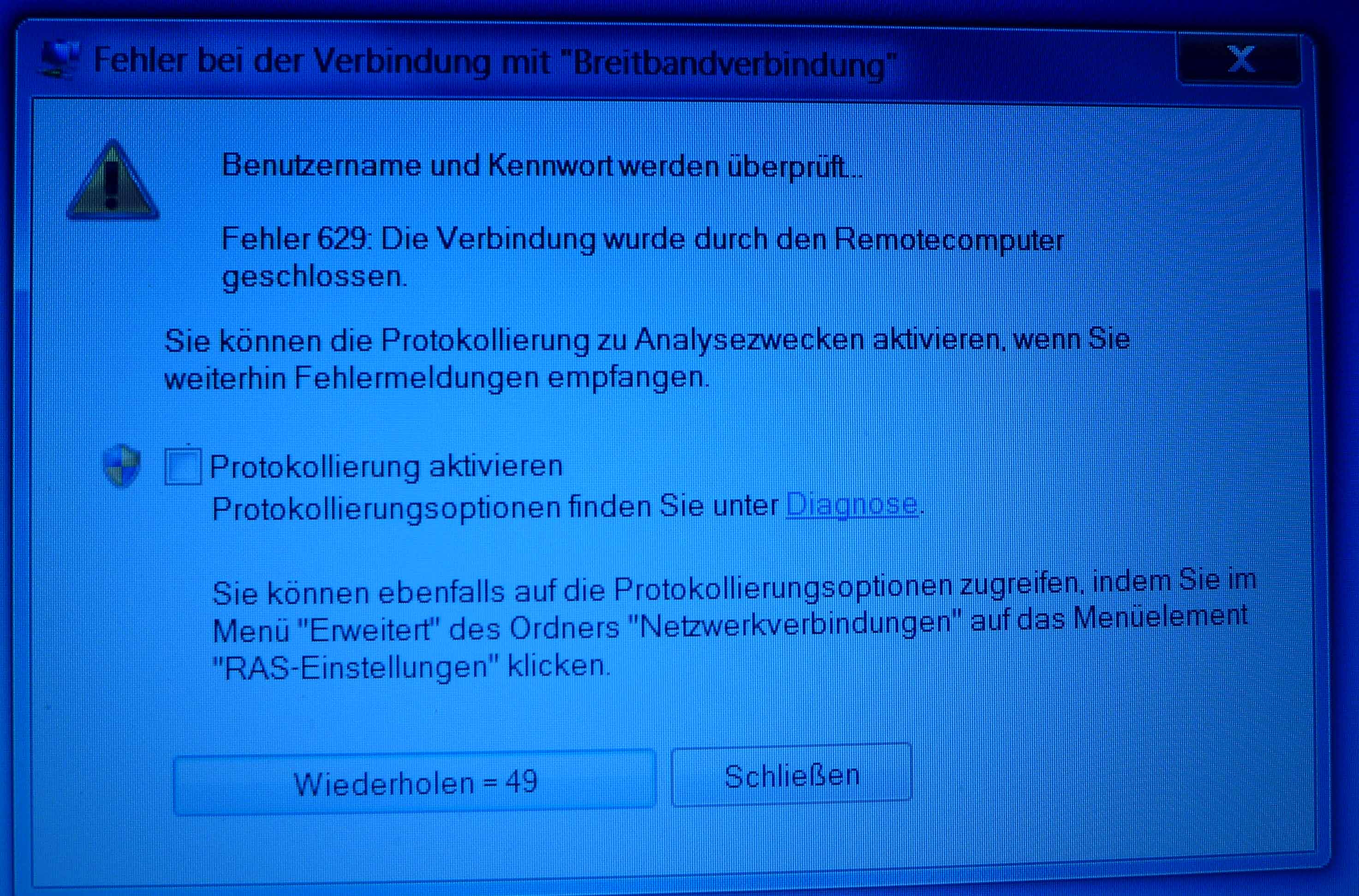 "Fehler 629 - Die Verbindung wurde durch den Remotecomputer geschlossen", kommt als Meldung.