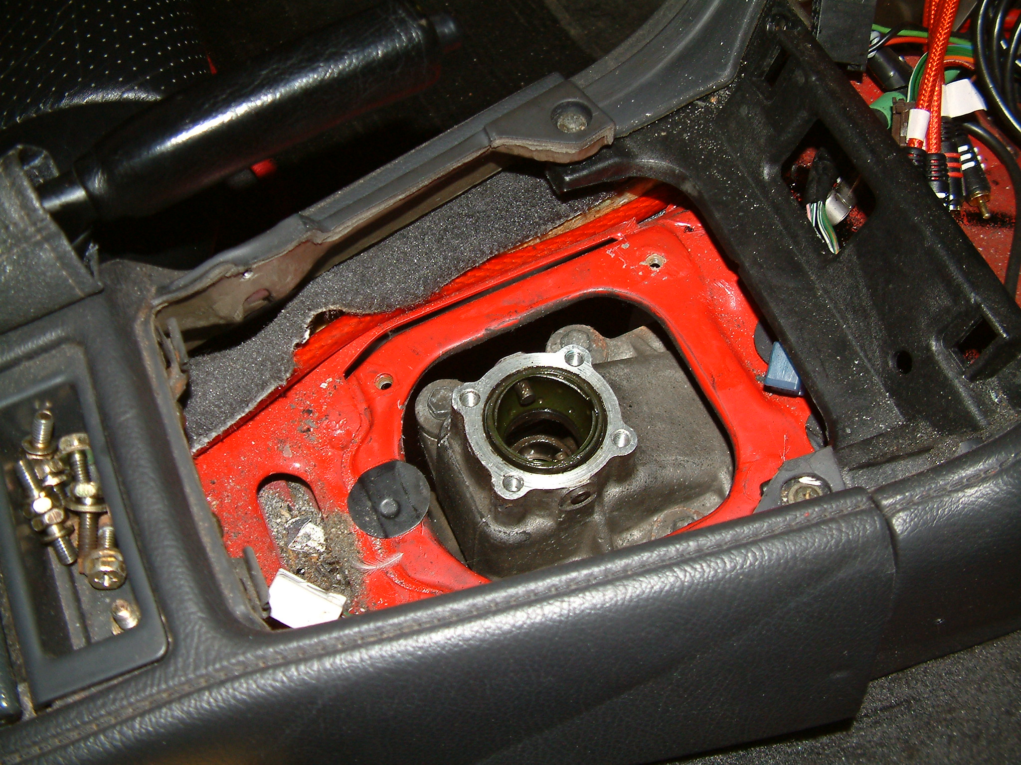 Beginn der Zerlegung, Schaltkulisse entfernt. Rechts sieht man noch das damals von mir verlegte, recht hochwertige Oehlbach CC2 Cinchkabel. So gut ich schon damals (und auch heute noch) mit HiFi und teils auch Elektronik war/bin, so mies bin ich weiterhin mit Mechanik rund um's Auto. Da lasse ich gerne die Spezialisten ran.