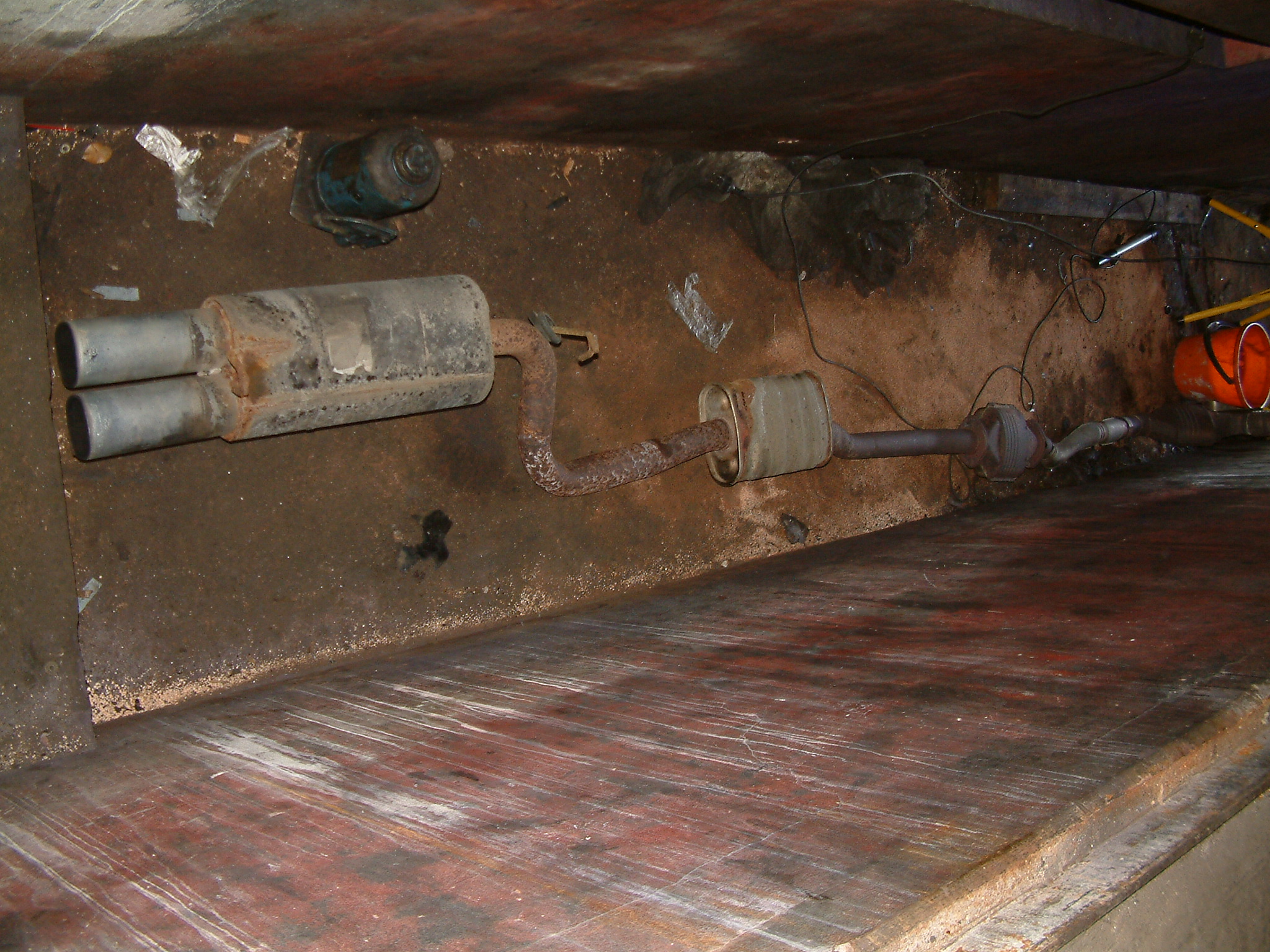 Demontierte Abgasanlage (Original bis auf Endtopf, den hat einer der fünf Vorbesitzer mal gewechselt). Im 2. Bild der Unterboden mit nun freier Einhausung, wo die AGA entlangläuft. Der Unterboden sieht zum Glück gut aus, die AGA ist durch.