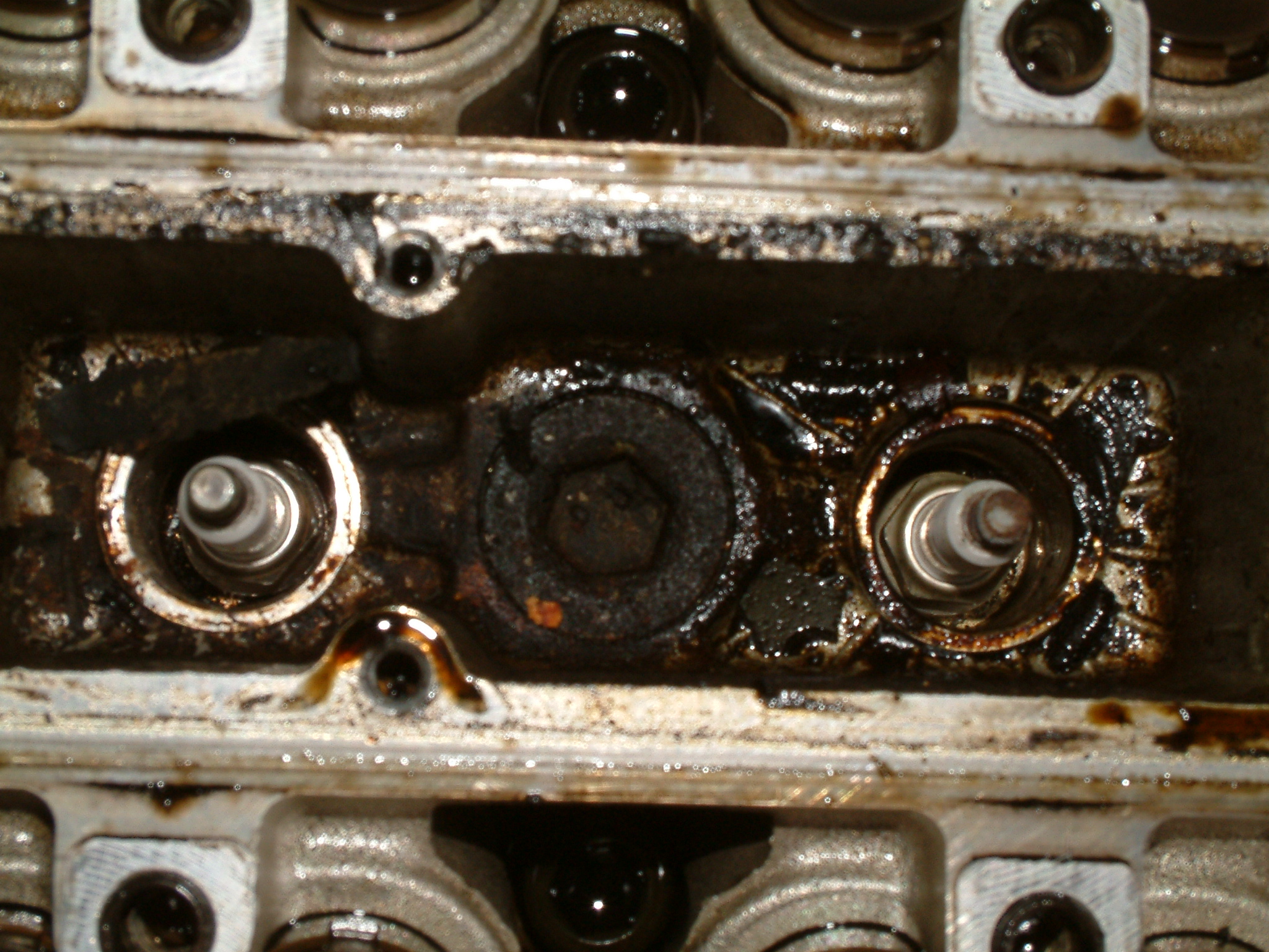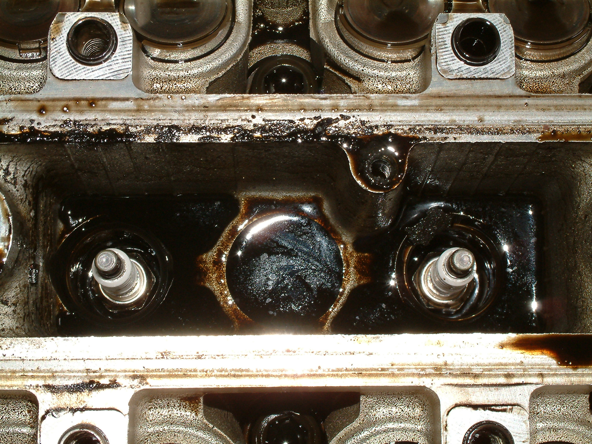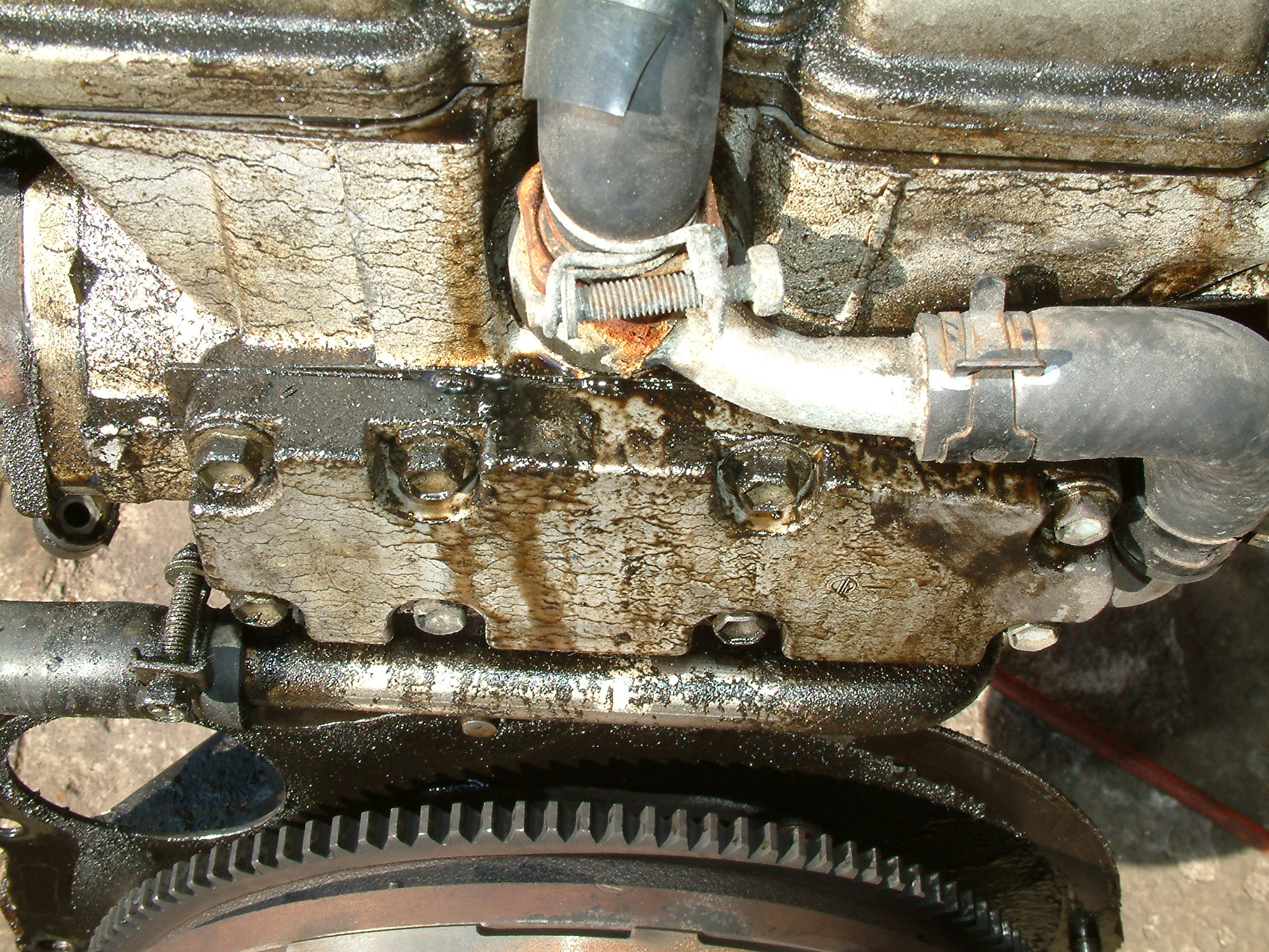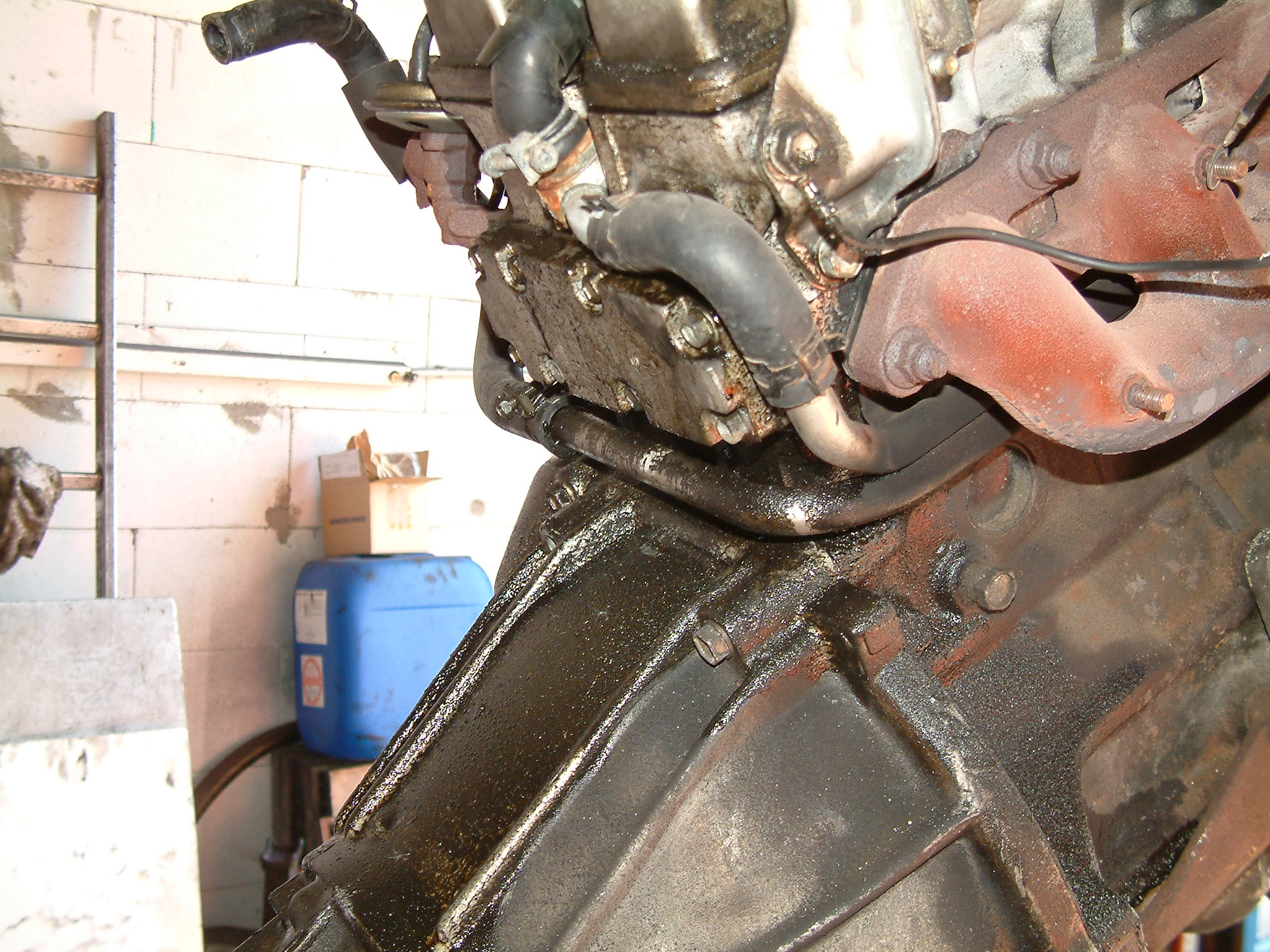 Noch ein Bisschen mehr Öl, das nicht dort geblieben ist, wo es hinsollte. Zu sehen ist der hinterste Zylinder (unten die Kupplung zum Getriebe hin), vermutlich ist da über Jahre hinweg alles aus der Ventildeckel- und auch Kopfdichtung herausgesuppt und immer hinten schön komplett über das Getriebe entlang heruntergelaufen.