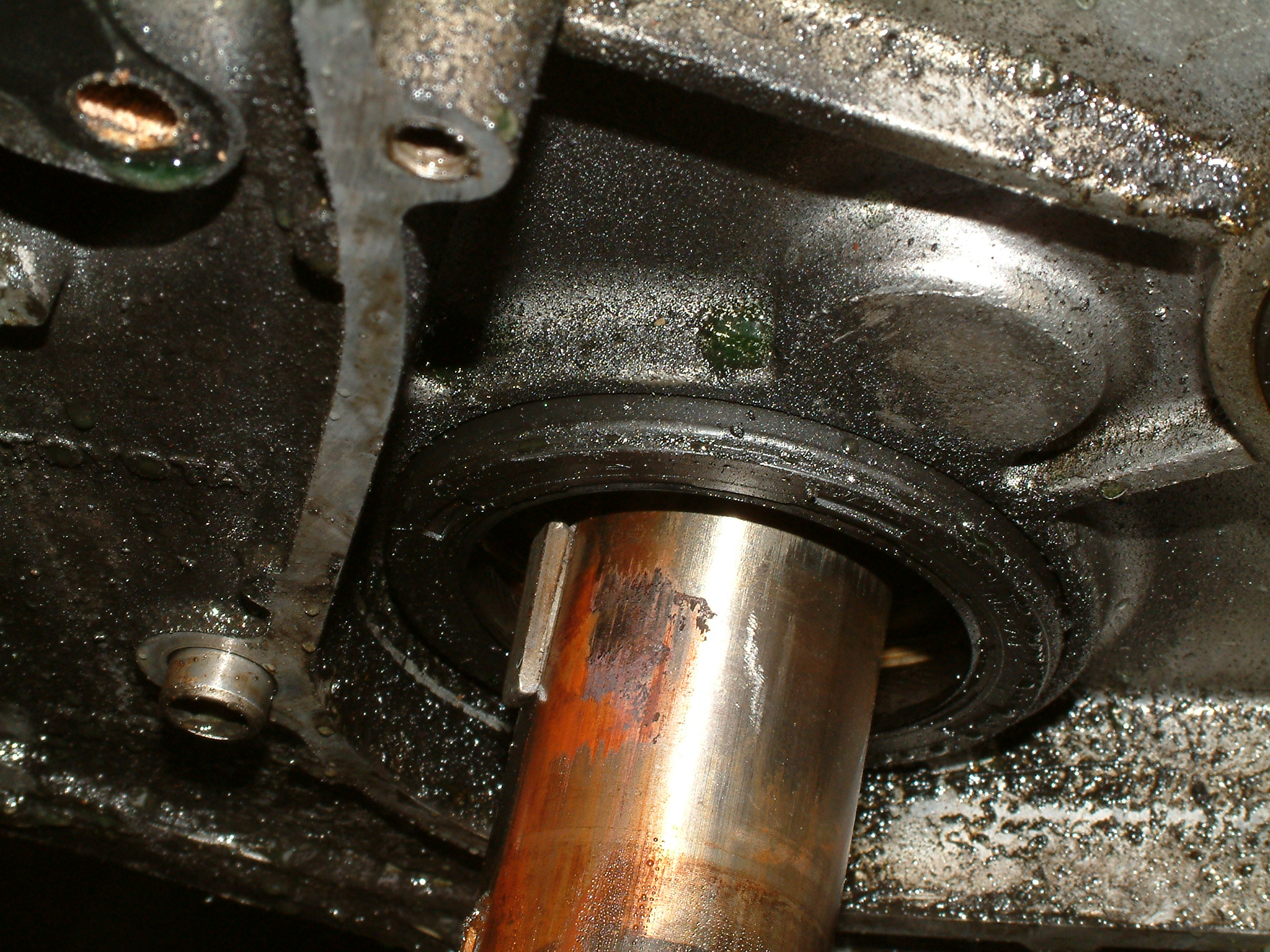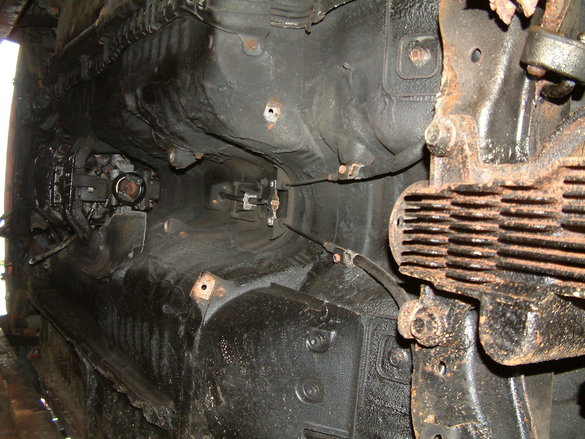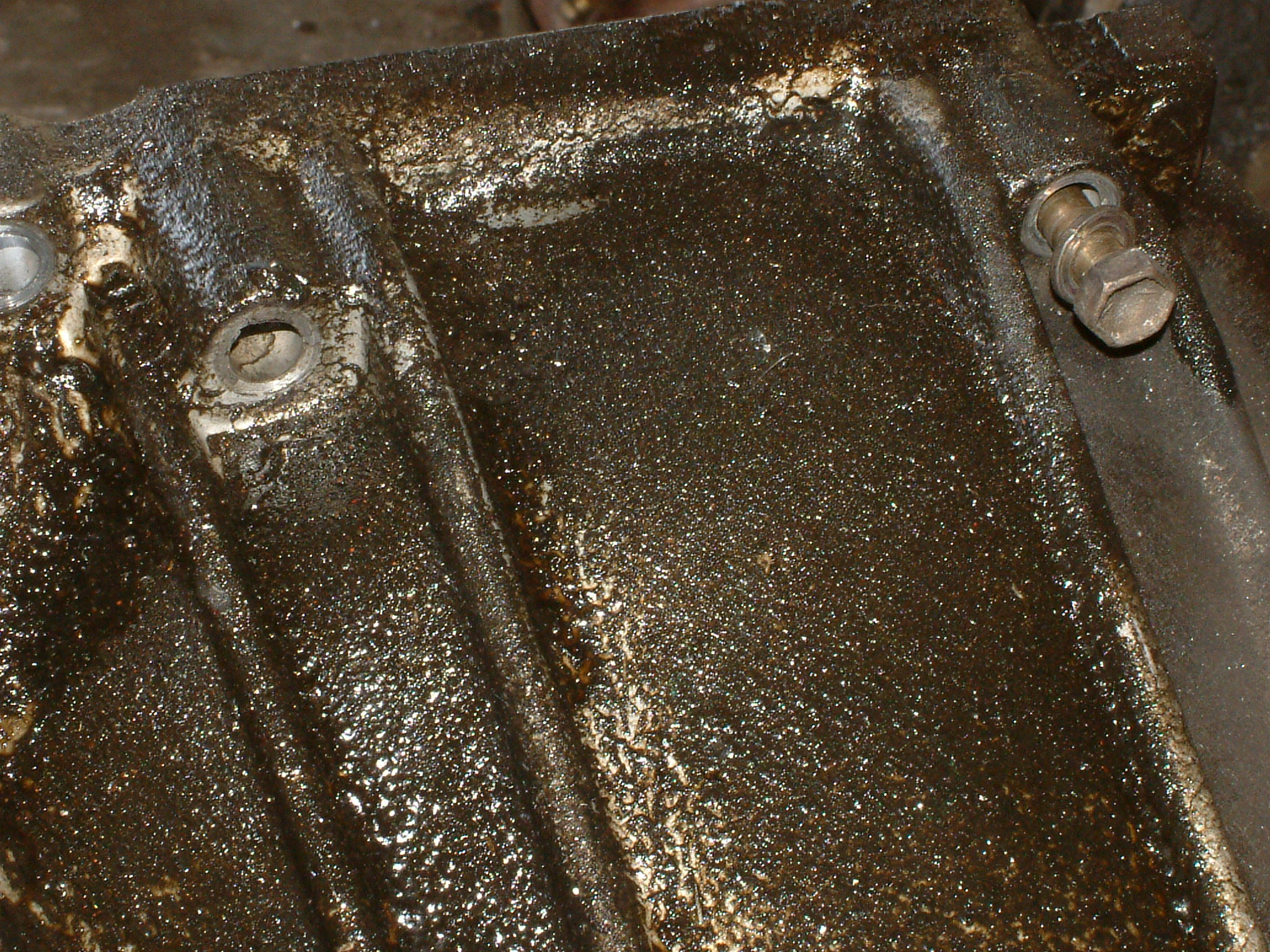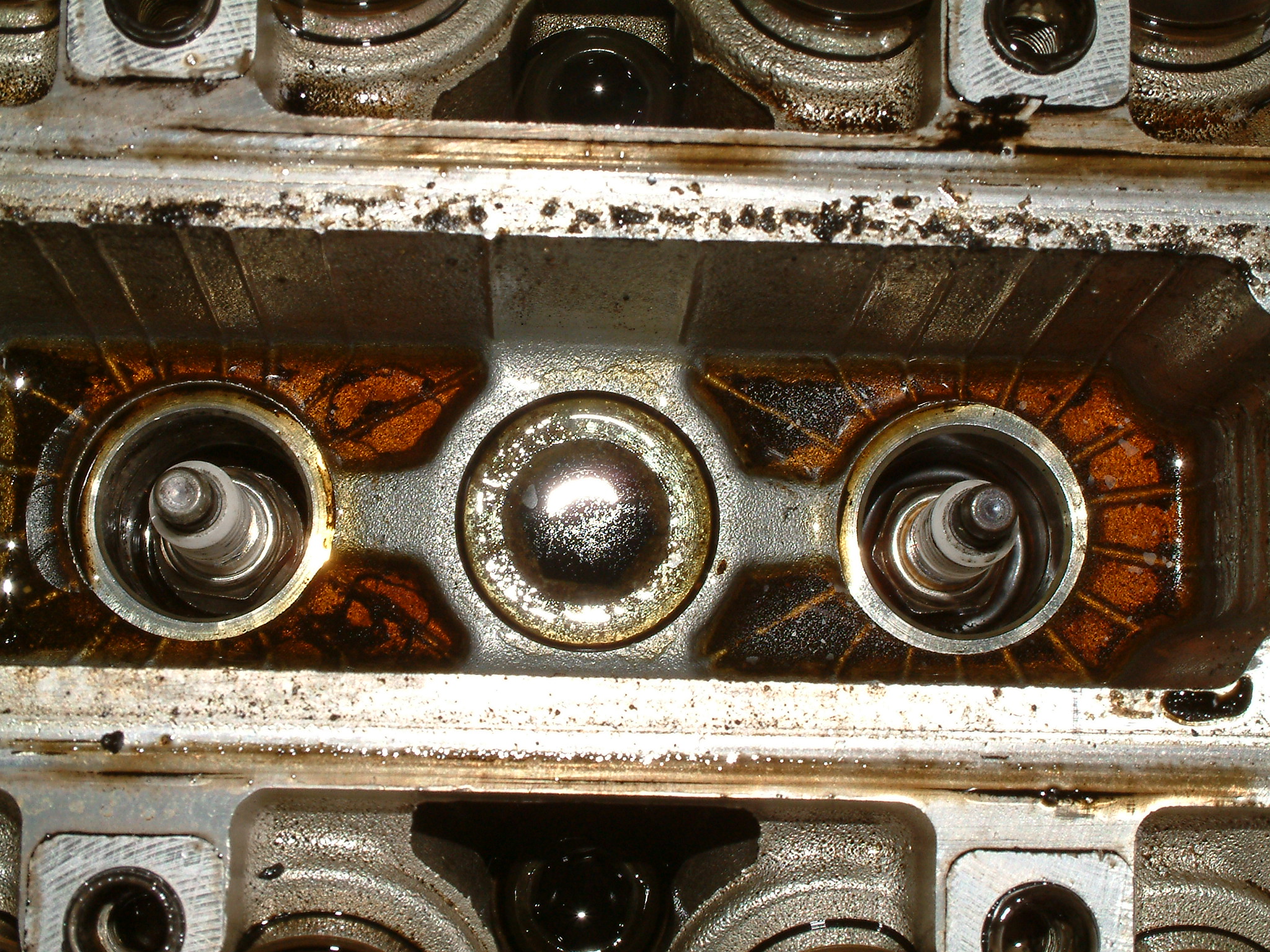 Noch ein Bisschen mehr Öl, das nicht dort geblieben ist, wo es hinsollte. Zu sehen ist der hinterste Zylinder (unten die Kupplung zum Getriebe hin), vermutlich ist da über Jahre hinweg alles aus der Ventildeckel- und auch Kopfdichtung herausgesuppt und immer hinten schön komplett über das Getriebe entlang heruntergelaufen.