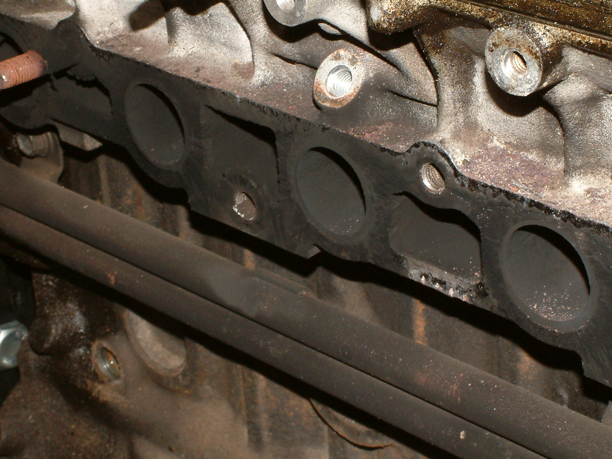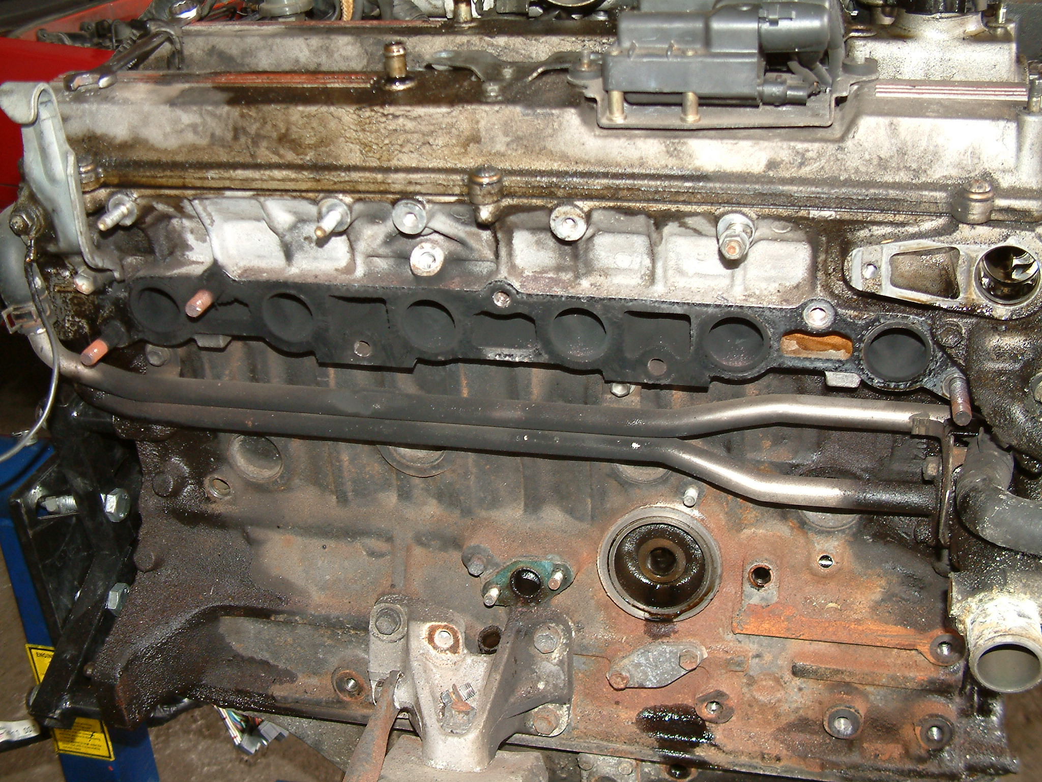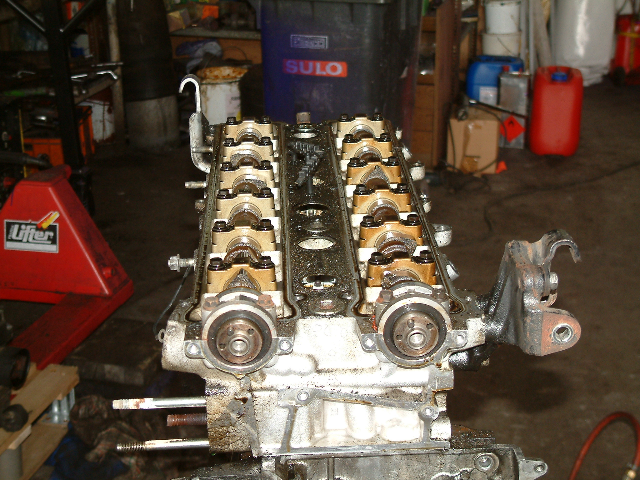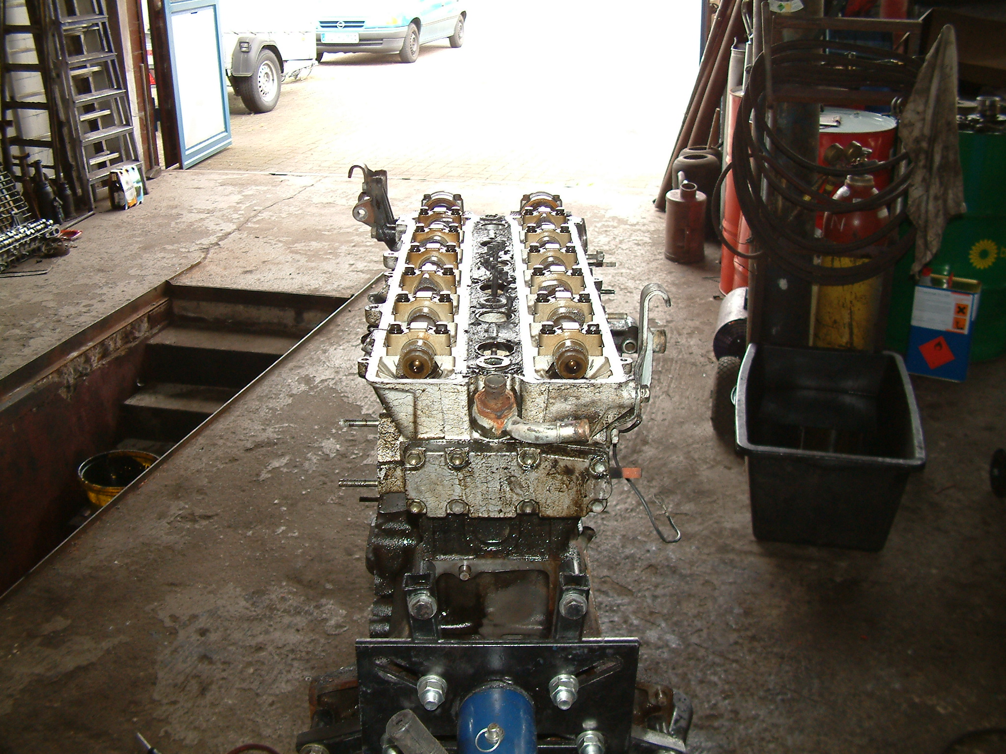 Noch ein Bisschen mehr Öl, das nicht dort geblieben ist, wo es hinsollte. Zu sehen ist der hinterste Zylinder (unten die Kupplung zum Getriebe hin), vermutlich ist da über Jahre hinweg alles aus der Ventildeckel- und auch Kopfdichtung herausgesuppt und immer hinten schön komplett über das Getriebe entlang heruntergelaufen.