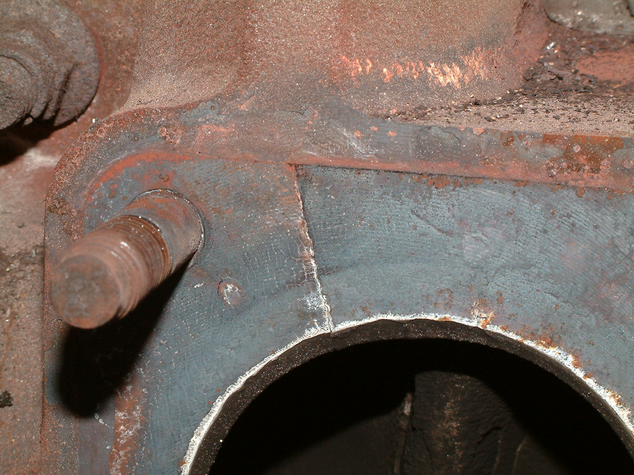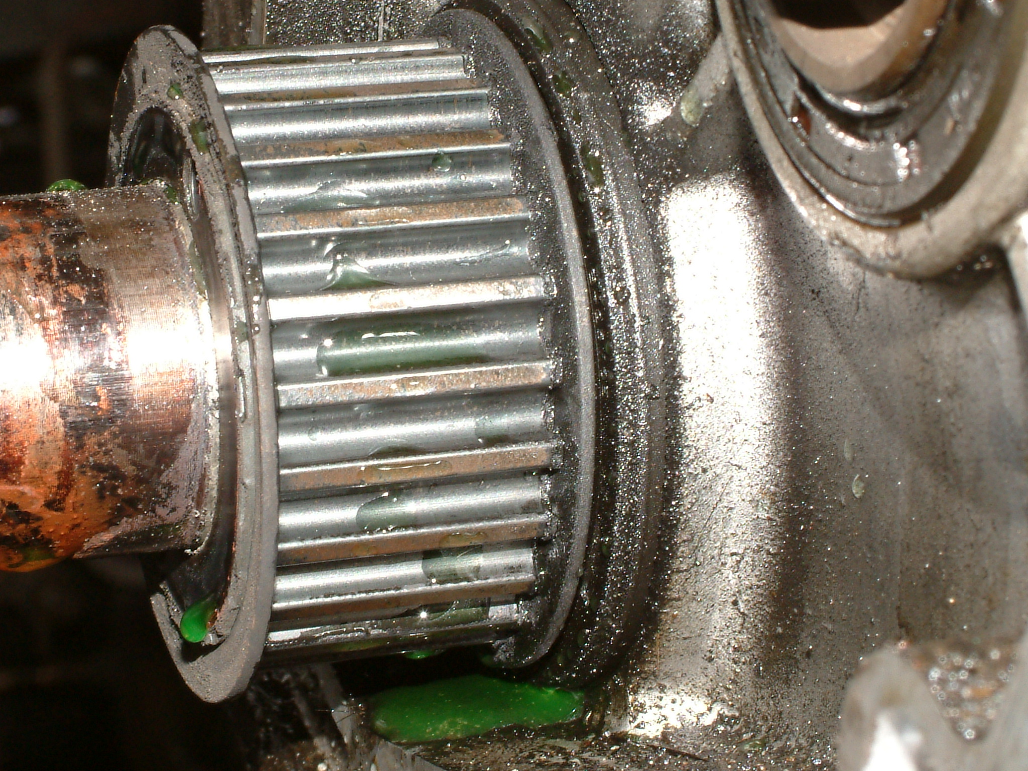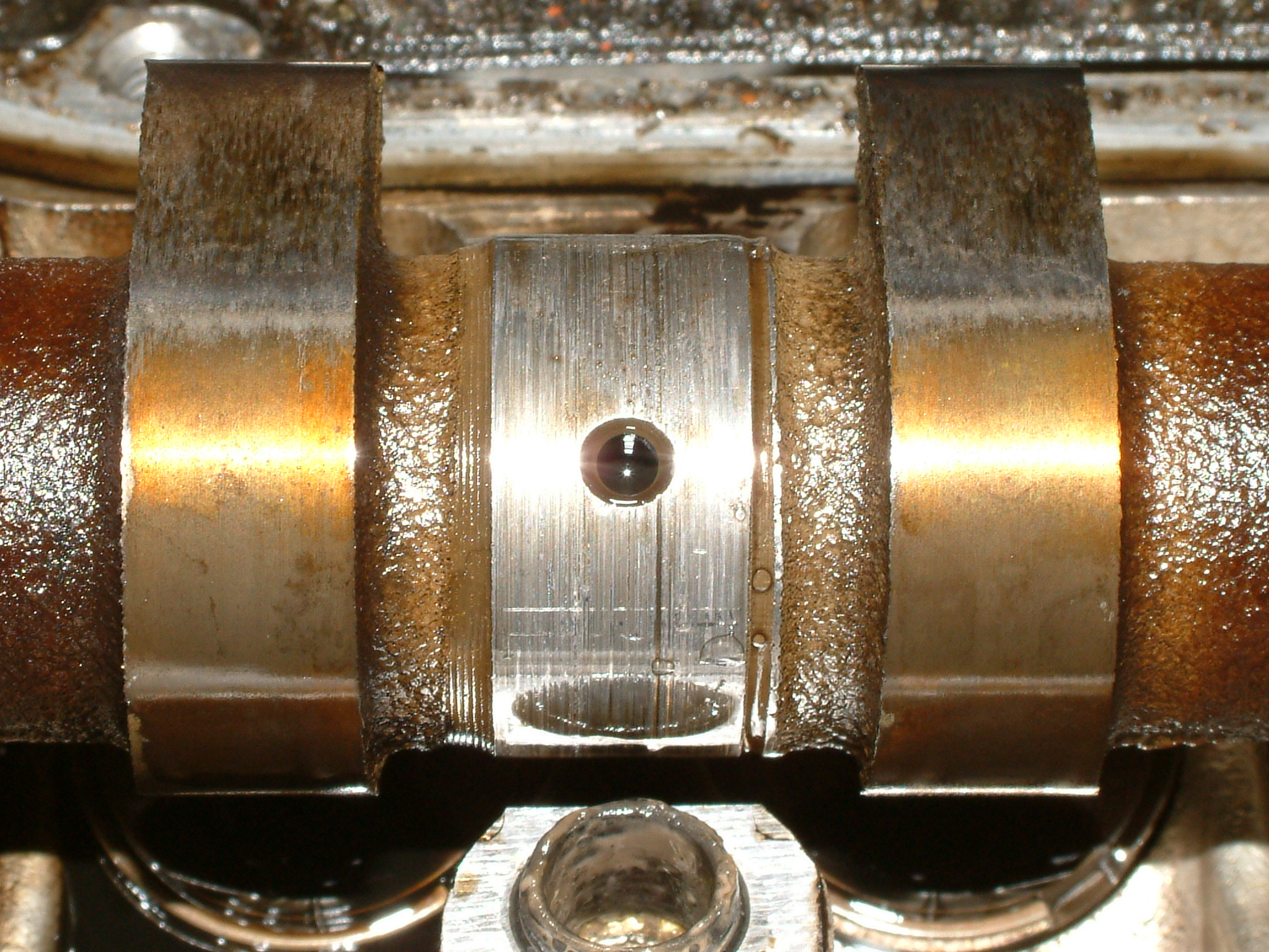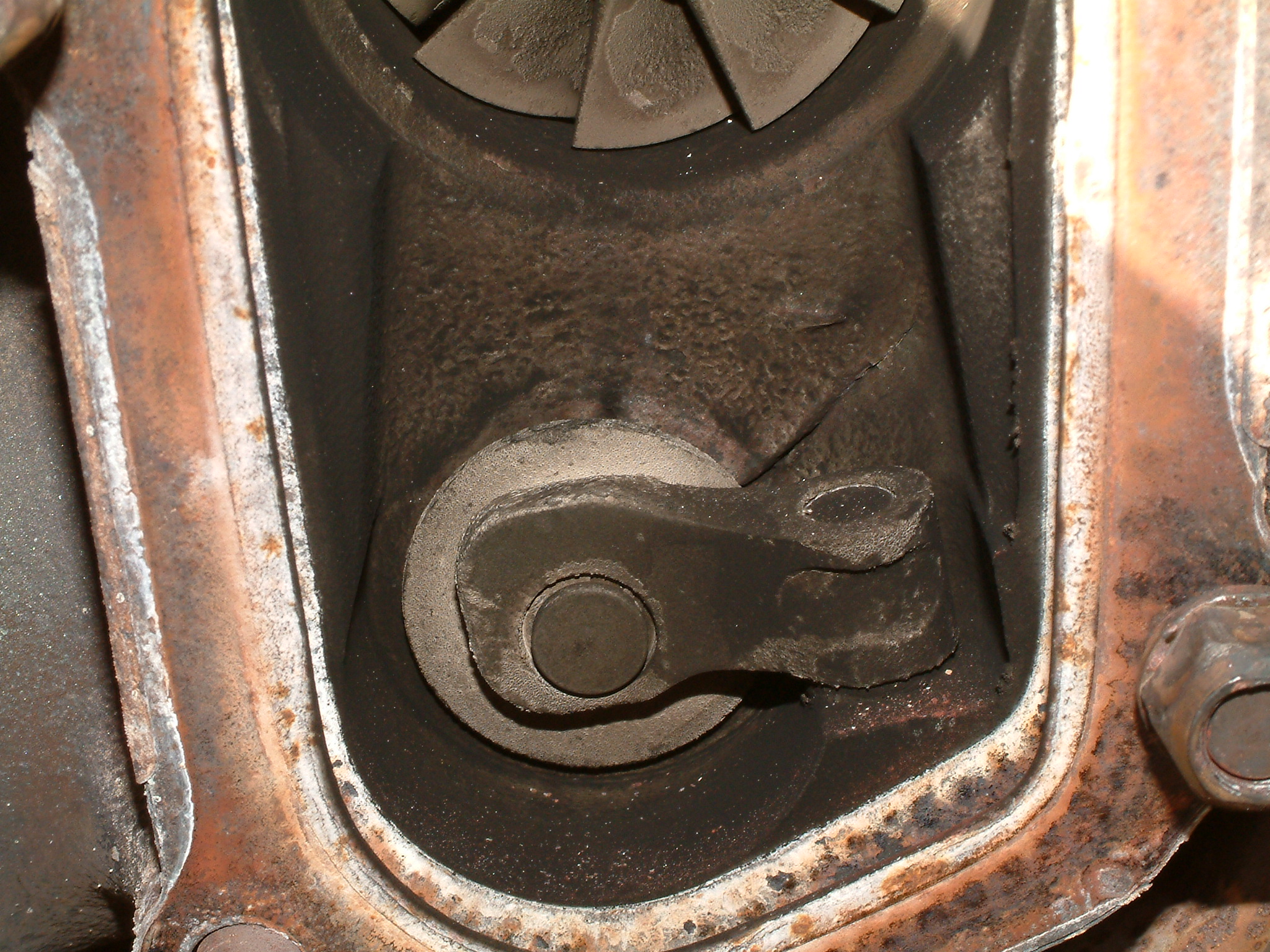 Noch ein Bisschen mehr Öl, das nicht dort geblieben ist, wo es hinsollte. Zu sehen ist der hinterste Zylinder (unten die Kupplung zum Getriebe hin), vermutlich ist da über Jahre hinweg alles aus der Ventildeckel- und auch Kopfdichtung herausgesuppt und immer hinten schön komplett über das Getriebe entlang heruntergelaufen.