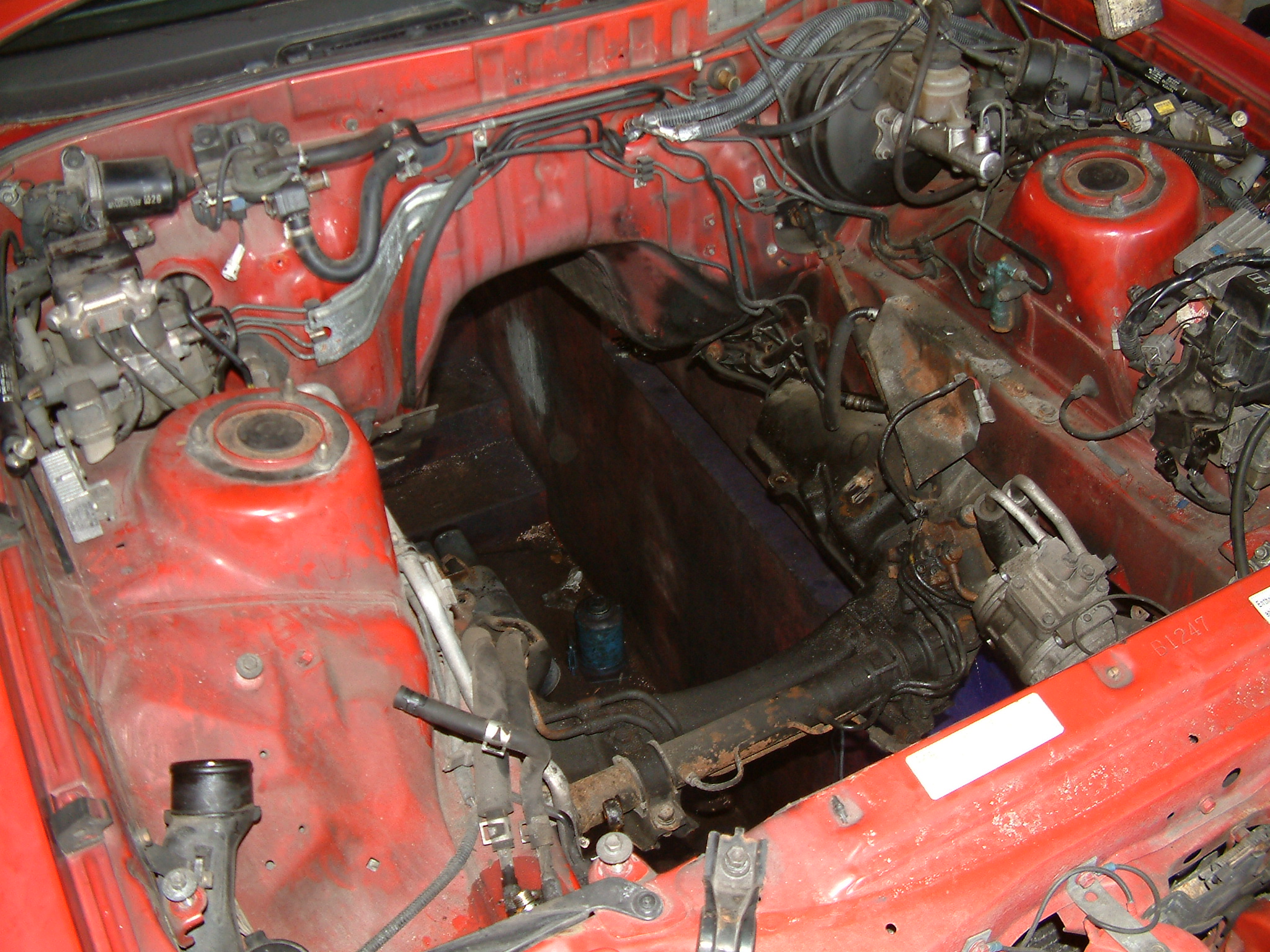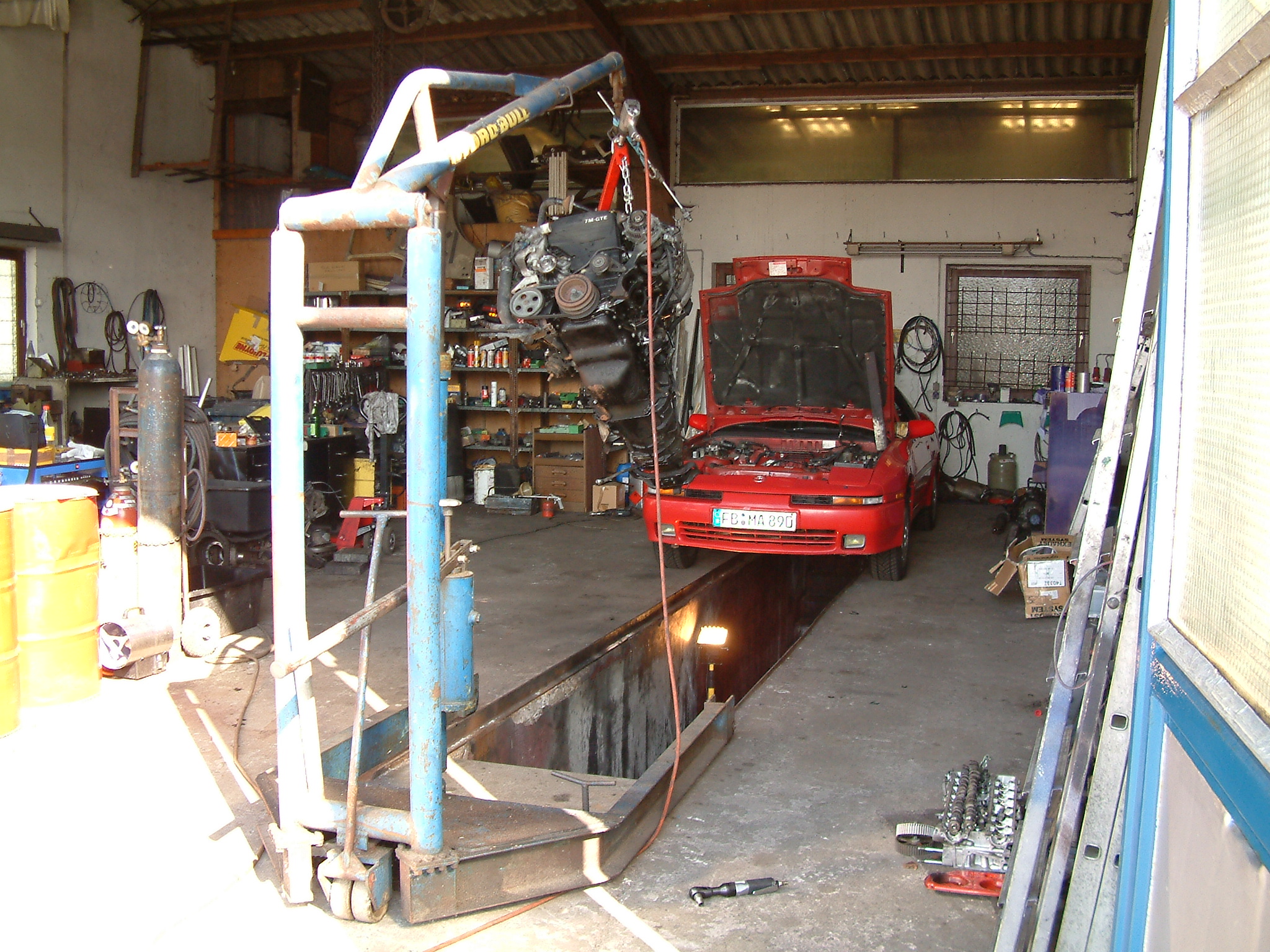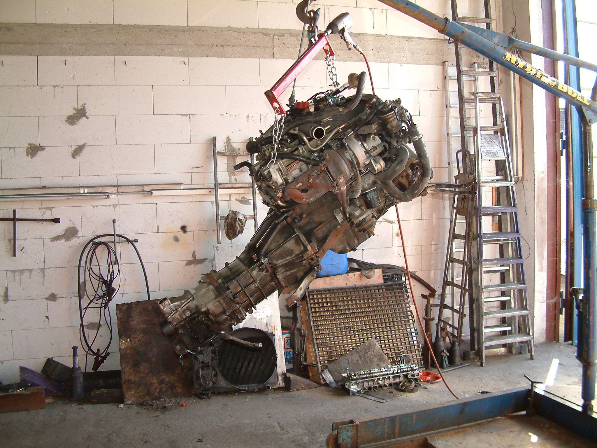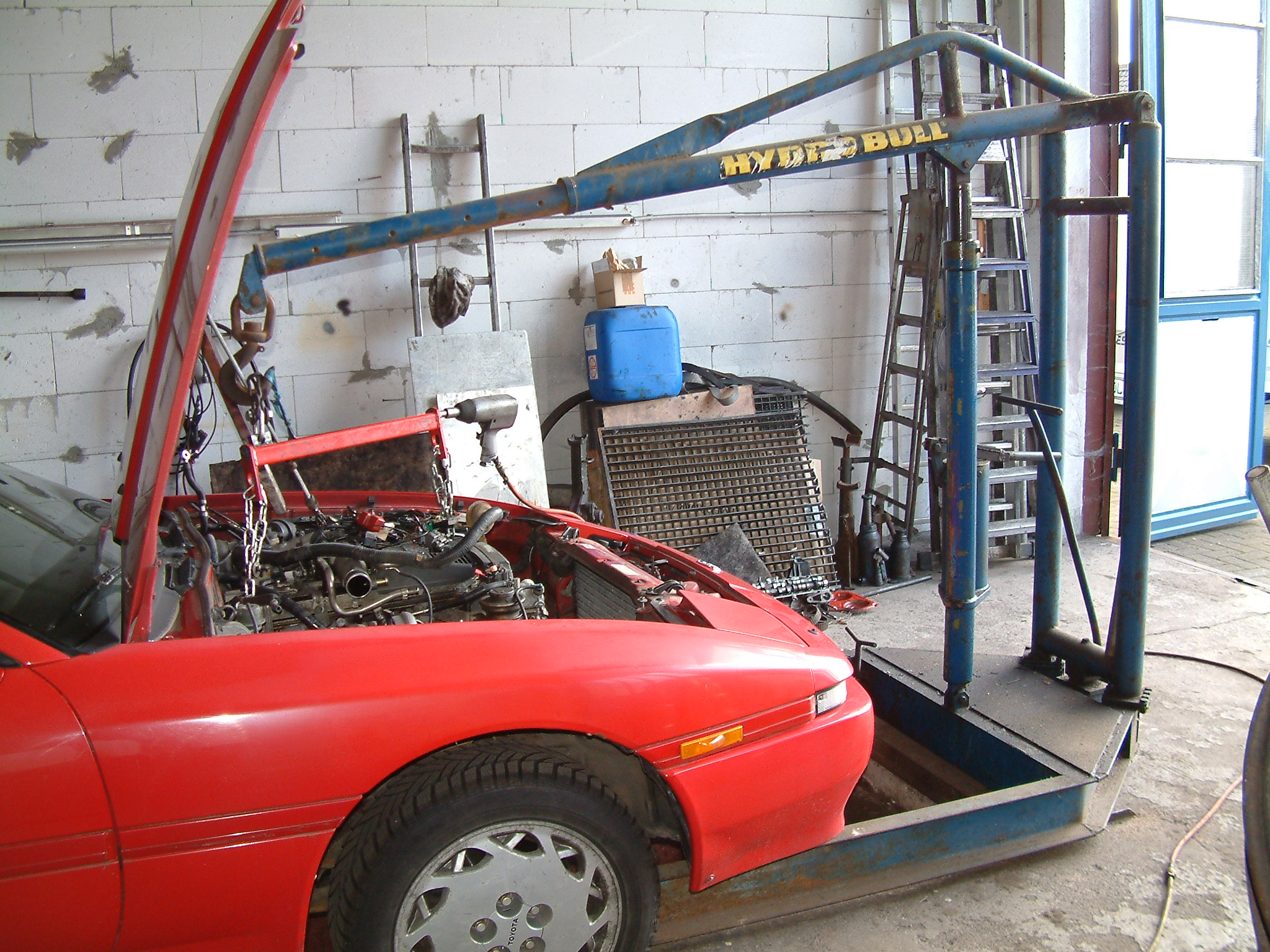 Motorraum, Demontage diverser Anbauteile, der Wasserkühler samt Viskolüfter ist bereits raus. Haubendämpfer entfernt, um die Motorhaube senkrecht aufstellen zu können und dann rückt der "Motorkran" an.