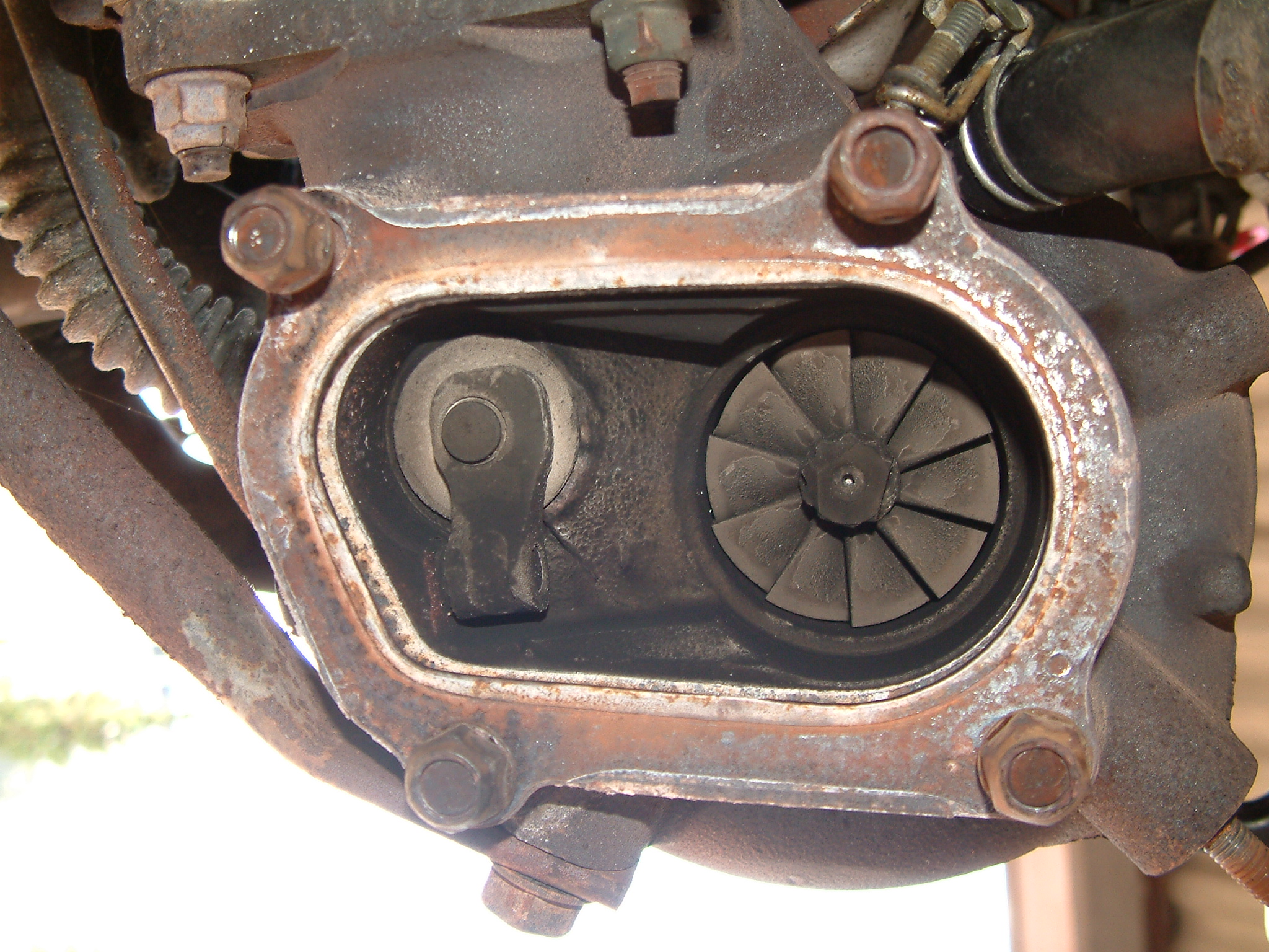 Turbolader Auslassseite. Wer genau hinschaut, entdeckt den "Grand Canyon" am Wastegate. Werksseitig überschreitet der Lader die 0,4 Bar Ladedruck nicht. Toyota wusste, dass der 3 Liter 6-Zylinder lieber auf Stabilität als auf Leistung gebaut werden sollte (der Block ist generell grundsolide, der Kopf weniger). Wenn jedoch an der Leistungsschraube gedreht wird, ohne viele weitere thermische Aspekte des Motors in Betracht zu ziehen (der hinterste Zylinder an der Motorwand läuft heiß, die Kopfdichtung geht flöten), dann passieren genau solche Dinge.