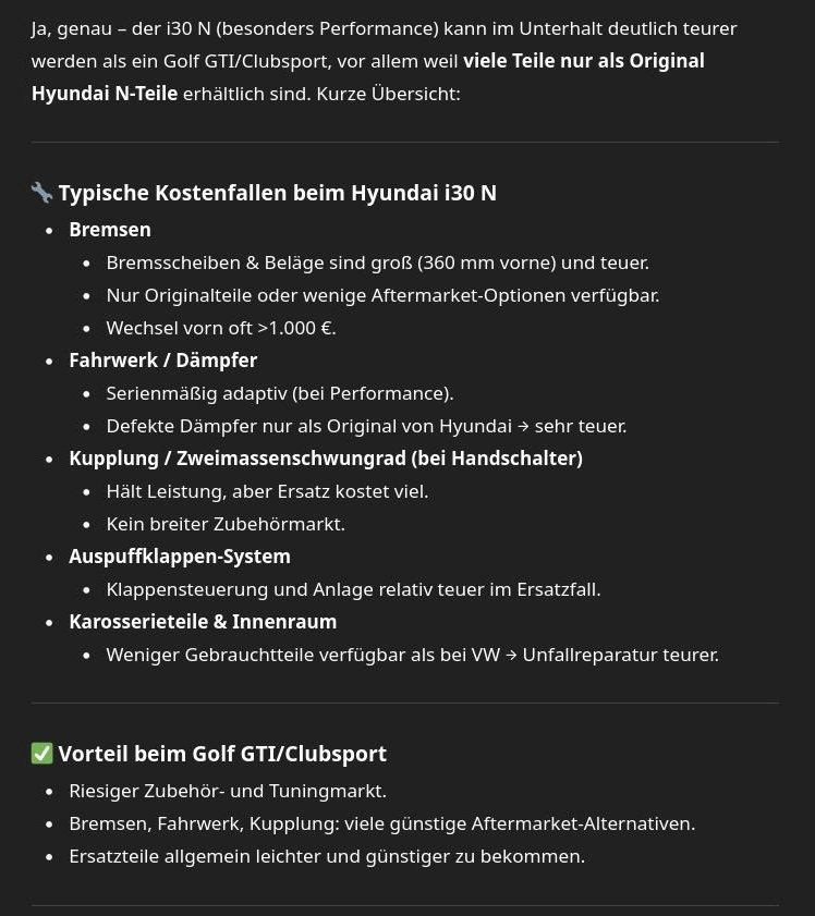 Ich versteh jetzt nicht, willst du neu oder gebraucht kaufen? Den I30N gibt es ja nicht mehr.DJMadMax schrieb:Gerne dürfen mir dann fünf mal die Dämpfer, AGA und Bremsen kaputtgehen - dann kommt man bestimmt auch so langsam an die 75.000 Euro Kaufpreis für einen Golf GTI Clubsport heran.