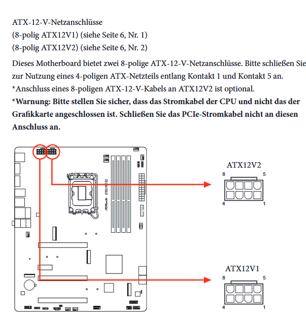 Das Mainboard hat den Anschluss ATX12v1 und ATX12v2. Für den V2 ist ein Kabel dabei. 6 Kabel auf 8 Kabel bzw P8 beim Netzteil.