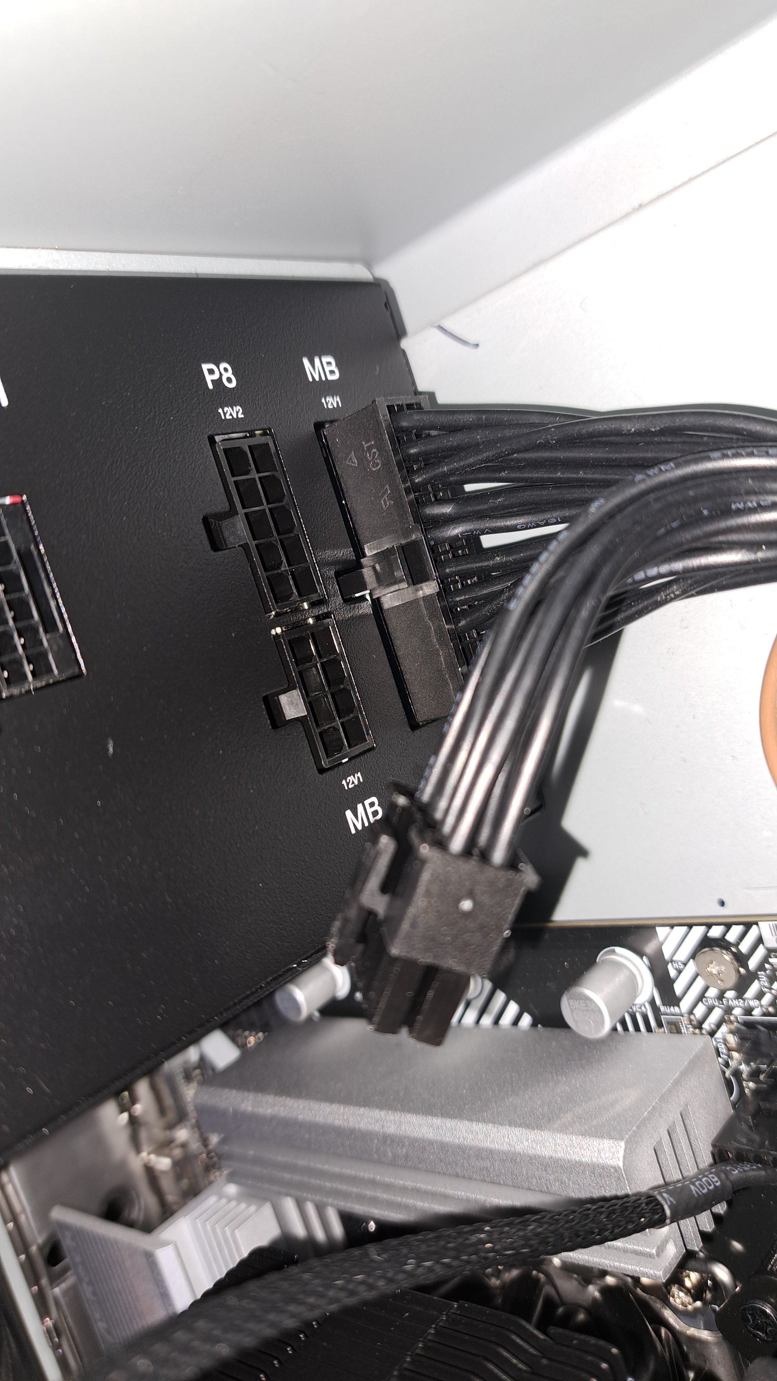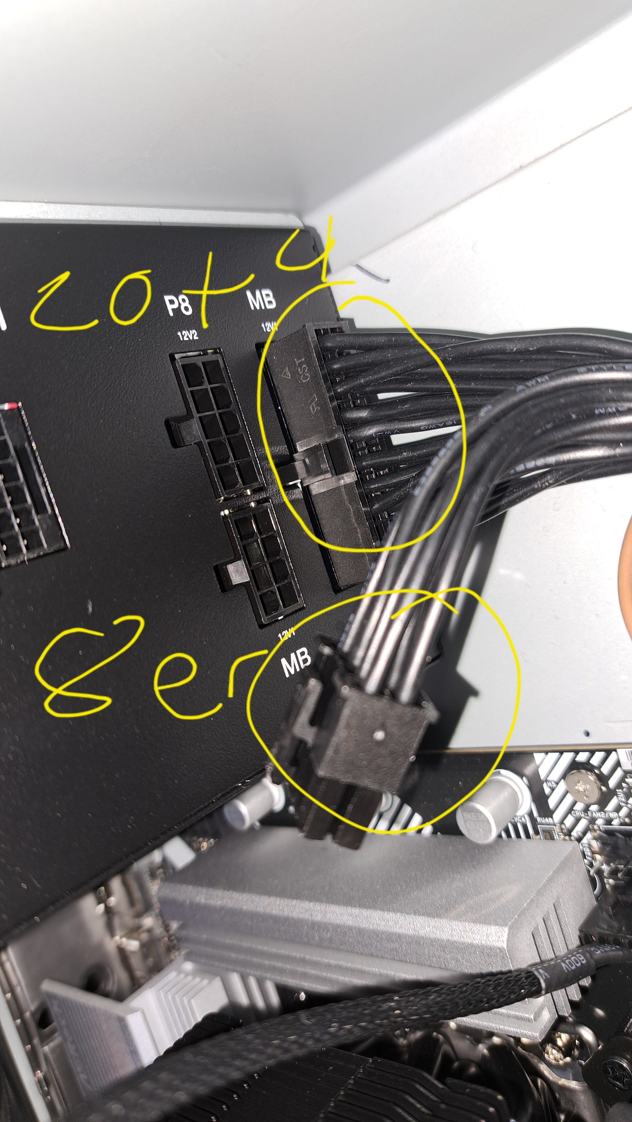 Du musst am NT, das geteilte 24-PIN 12V ATX Kabel an die beiden Anschlüsse mit MB anschließen. Am Mainboard das P8 an den entsprechenden Anschluss.