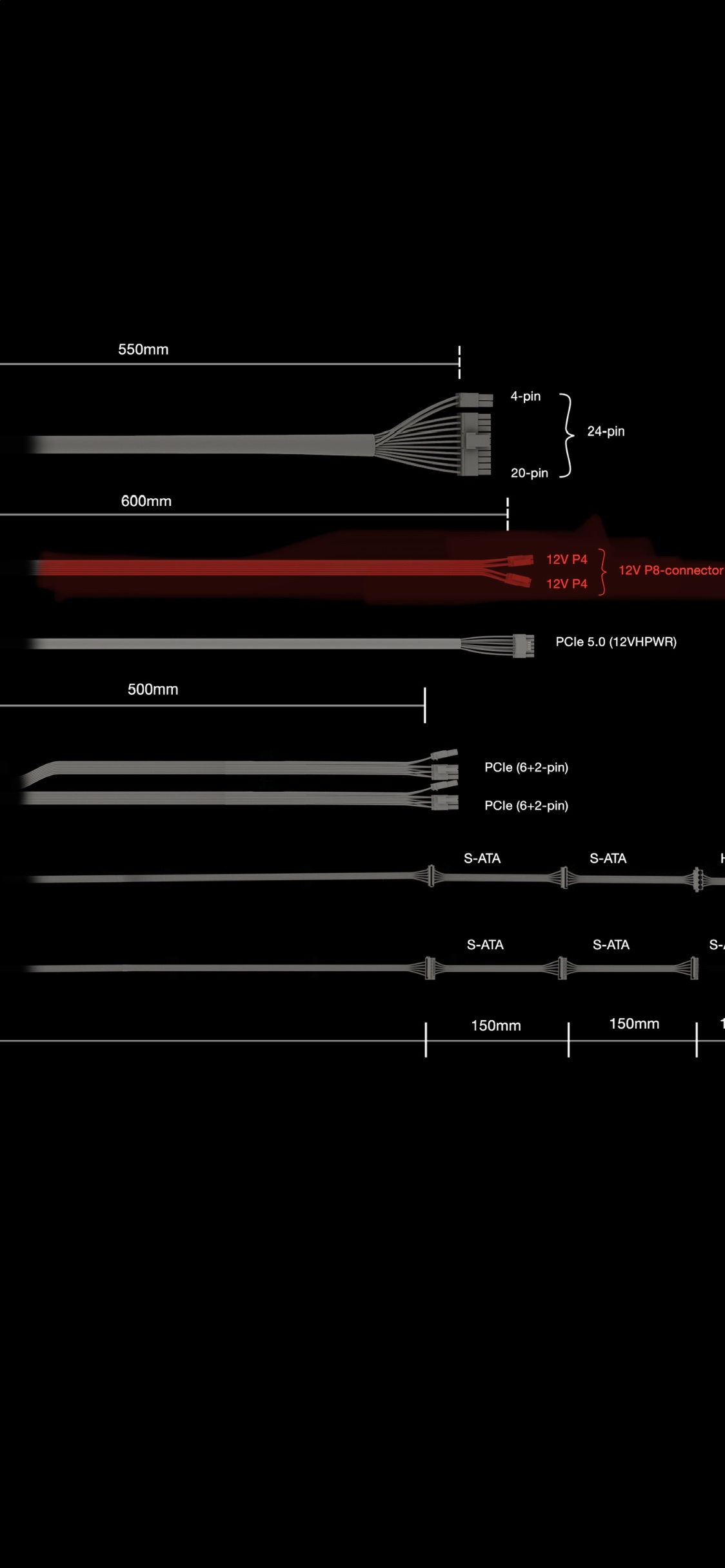 Die Ausstattung ändert sich je nach Leistungsaufnahme des Netzteils. In diesem Fall steckst du nur den P8 auf einem der zwei 8-Pins des Mainboards. Mehr Kabel hast du mit diesem Netzteil tatsächlich nicht mit dabei.