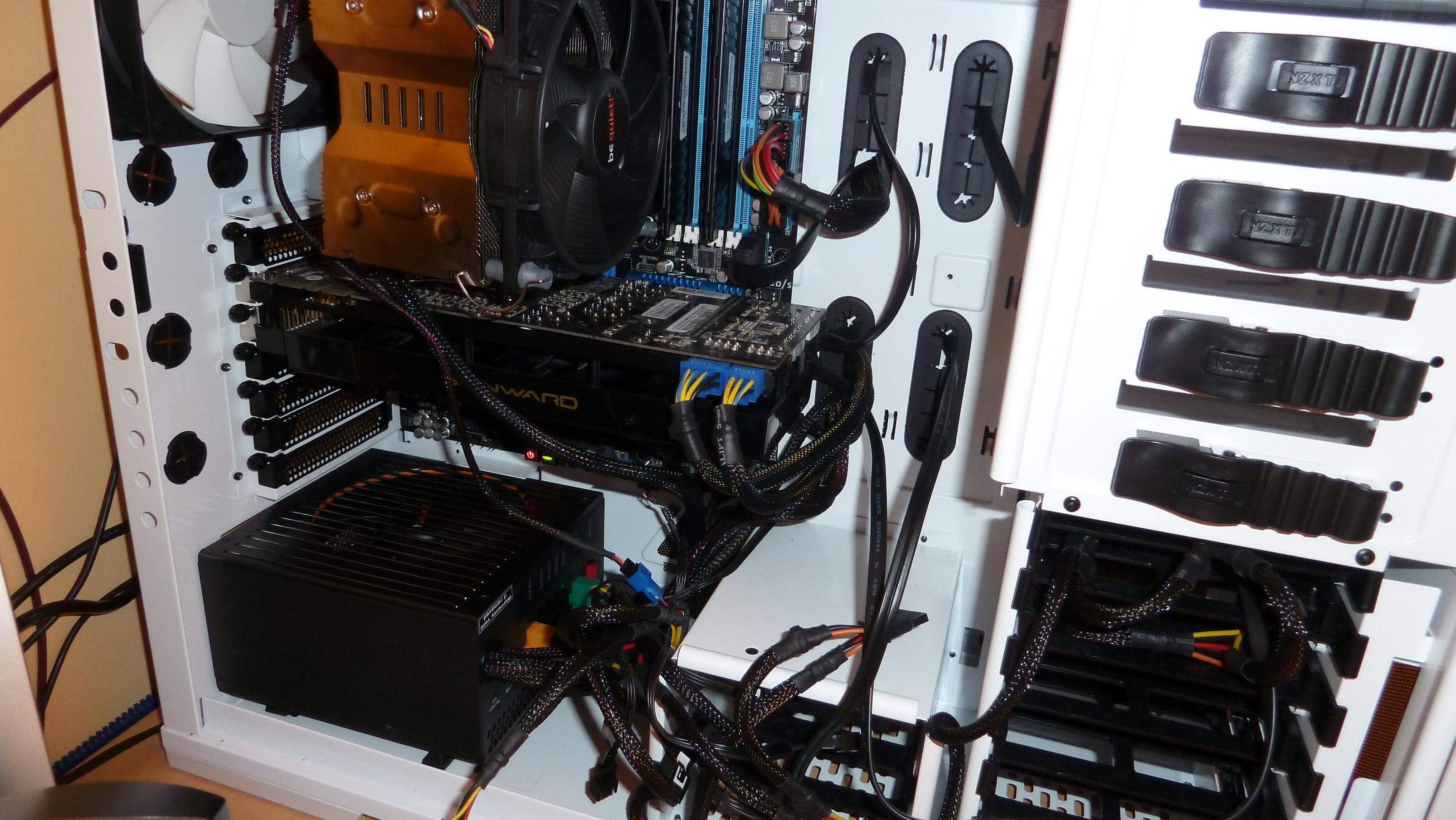Seit dem Einbau zog der Lüfter vom Boden des Gehäuses die Luft. Jetzt hab ich mal versucht das NT umzudrehen damit das NT die Luft vom Gehäuse Inneren saugt.