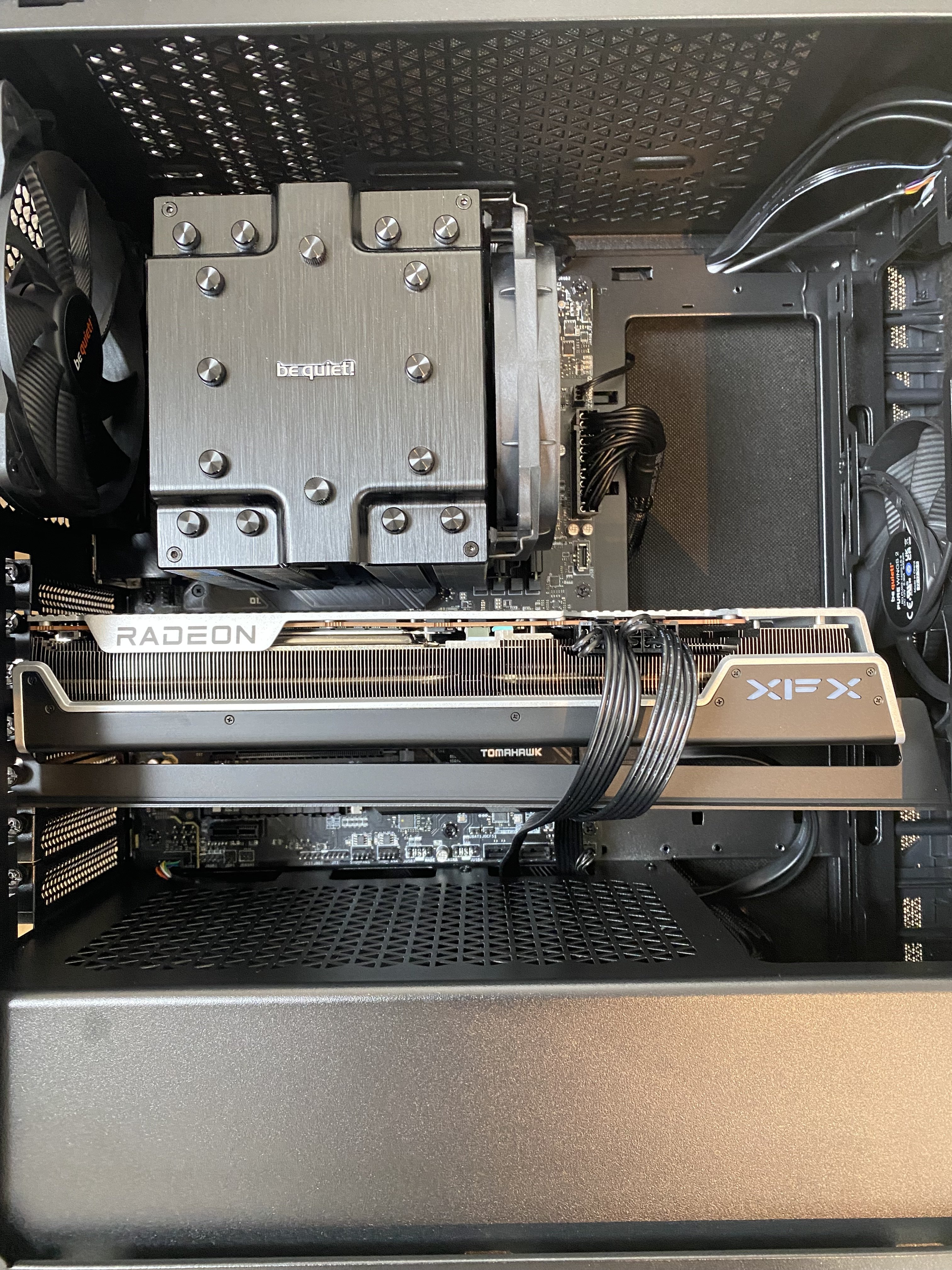1) Würde es Sinn machen bei den Komponenten einen zweiten 140mm in der Front zu verbauen? (Dieser Slot wird jedoch aktuell durch die "Anti GPU Slack Halterung" der XFX Black Edition geblockt siehe Bild.) Eigentlich müssten jedoch zwei 140mm ausreichend sein? Oder Sollte ich die Halterung abnehmen und einen zweiten 140mm in der Front verbauen? Der PCIe Slot des Mainboards ist ohnehin mit Metall verstärkt. Nur ist die RX7900XT ein ziemlicher brocken und die Halterung sicher nicht umsonst dabei?