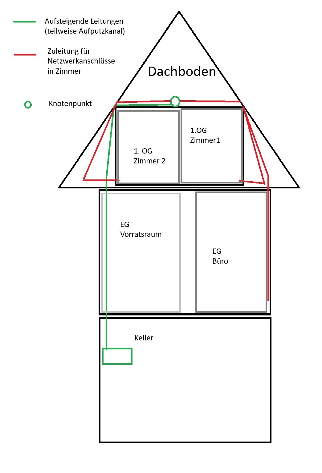 Aus dem Bauch heraus finde ich die Idee mit dem Switch auf dem Dachboden schon fast besser. Insbesondere, wenn später noch weitere Netzwerkanschlüsse dazukommen, muss nicht jedes Mal die gesamte Strecke bis zum Keller überquert werden. Aber über eure Hinweise und Ratschläge wäre ich dankbar!
