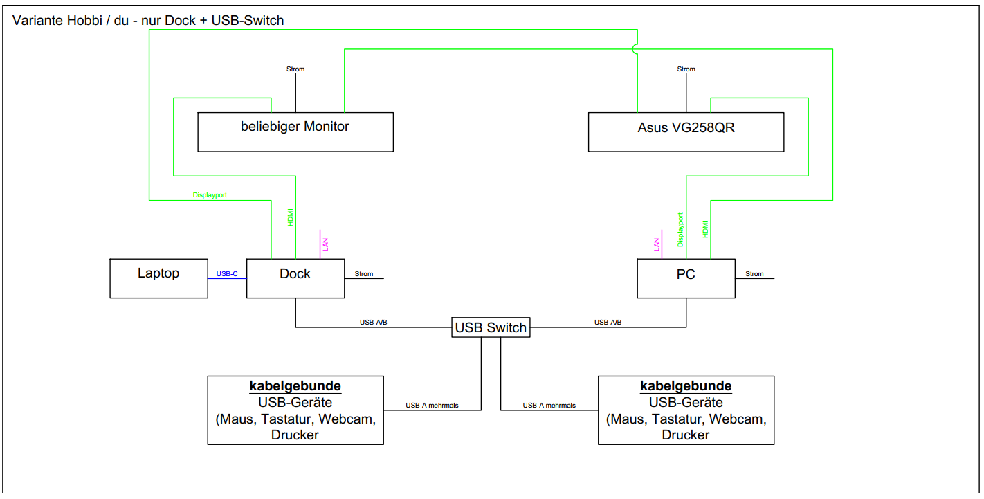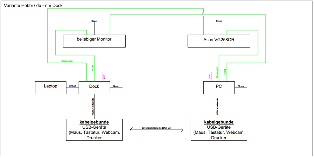 Je nachdem was Ich gerade benutze, sollten dann alle Geräte je mit Laptop oder PC funktionieren, ohne dass Ich einen Haufen Kabel umstecken muss. Idealerweise sollte der wechsel automatisch funktionieren, aber wenn Ich nur ein Kabel der Dockingstation umstecken muss, könnte Ich damit leben.