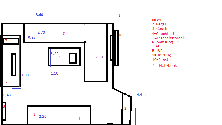 Das Problem ist, das mein Zimmer nicht das Größte ist und zimlich voll gestellt ist. (siehe Skizze)