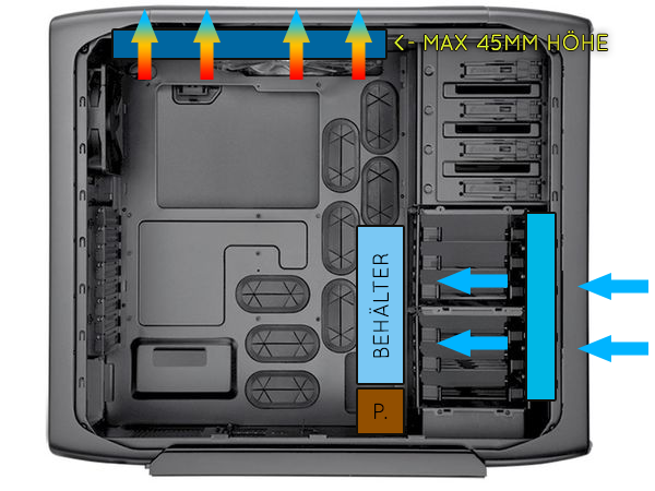 > im TOP soll hier ein 240MM-Radiator hin, der sollte nicht höher als 45MM, da vom Top zum Mainboard ca. 45MM Platz sind, bevor er direkt über den RAM-Riegeln ist.