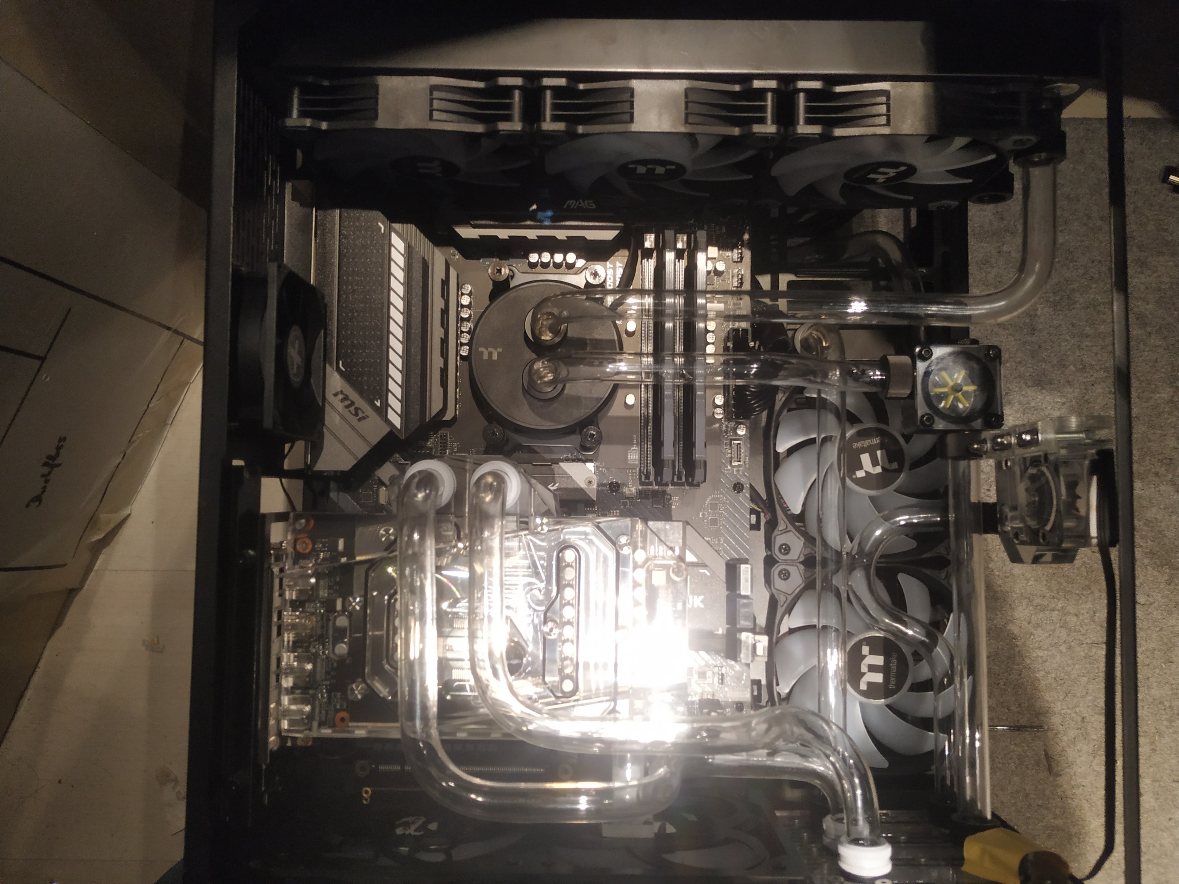 Ich bin bei Wasserkühlungen kein Experte, aber fehlt da nicht ein Ausgleichsbehälter und sind die Lüfter unten am Gehäuse nischt falsch montiert und blasen nach außen?
