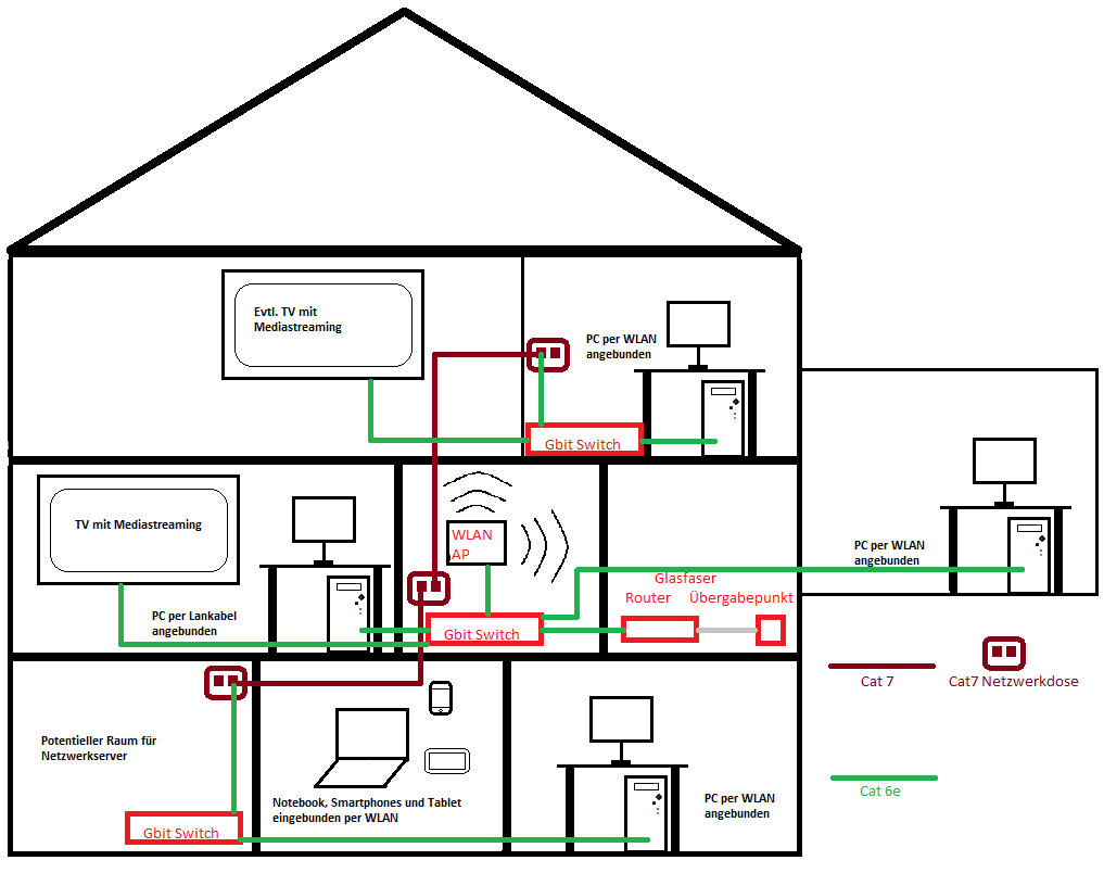 Um endlich einmal Struktur in unser Netzwerkchaos zu bringen ist mit dem Umstieg genau der richtige Zeitpunkt gekommen. Hier habe ich euch mal die aktuelle\zukünftige Situation im Haus skizziert.