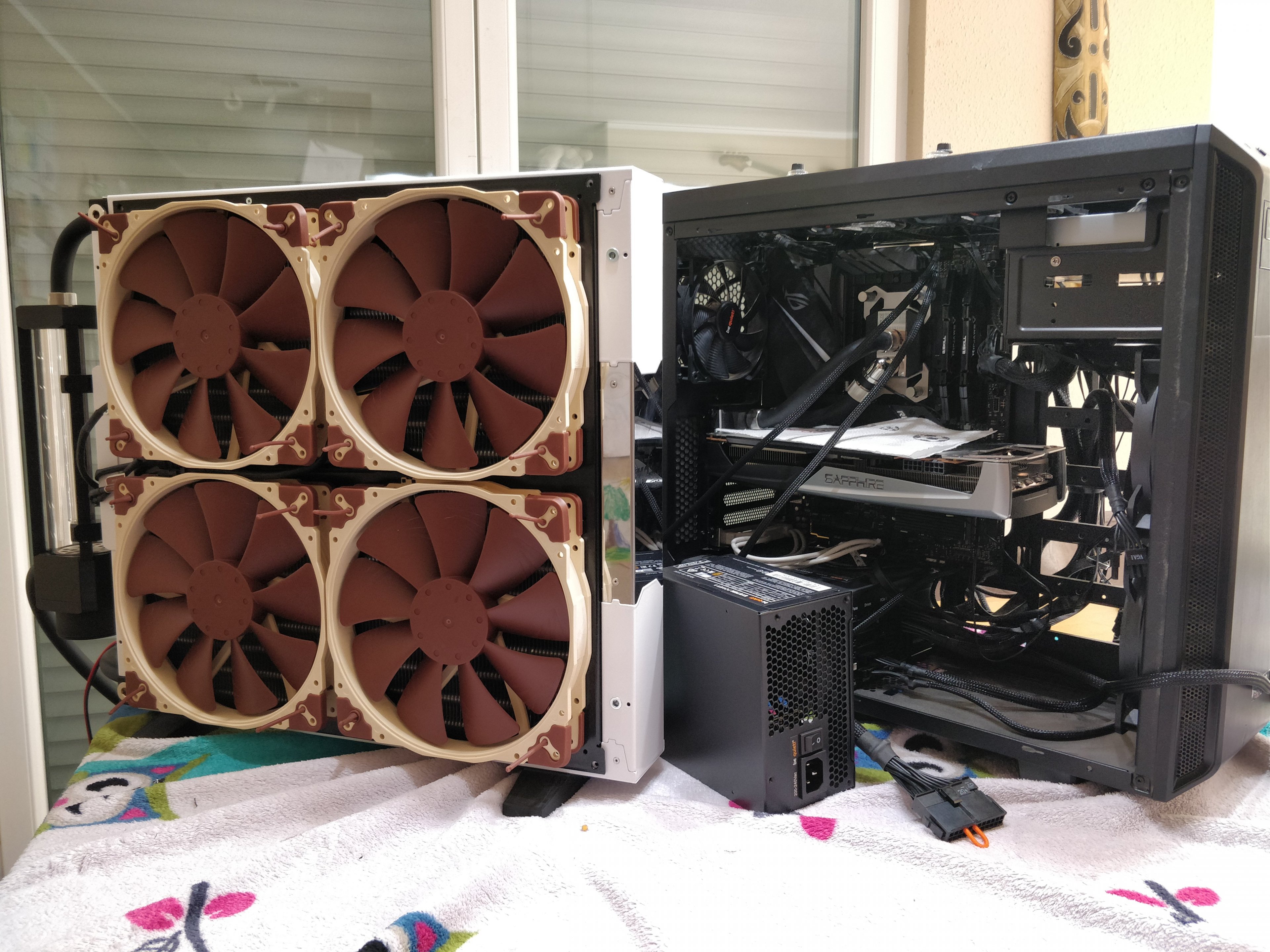 Ich lasse erstmal eine Weile so laufen. Ich habe keinen Plan, wodurch ich die Kabeln aus dem Gehäuse führen werde (die für die Lüfter am Radi, Pumpe usw). Soweit ist alles dicht.