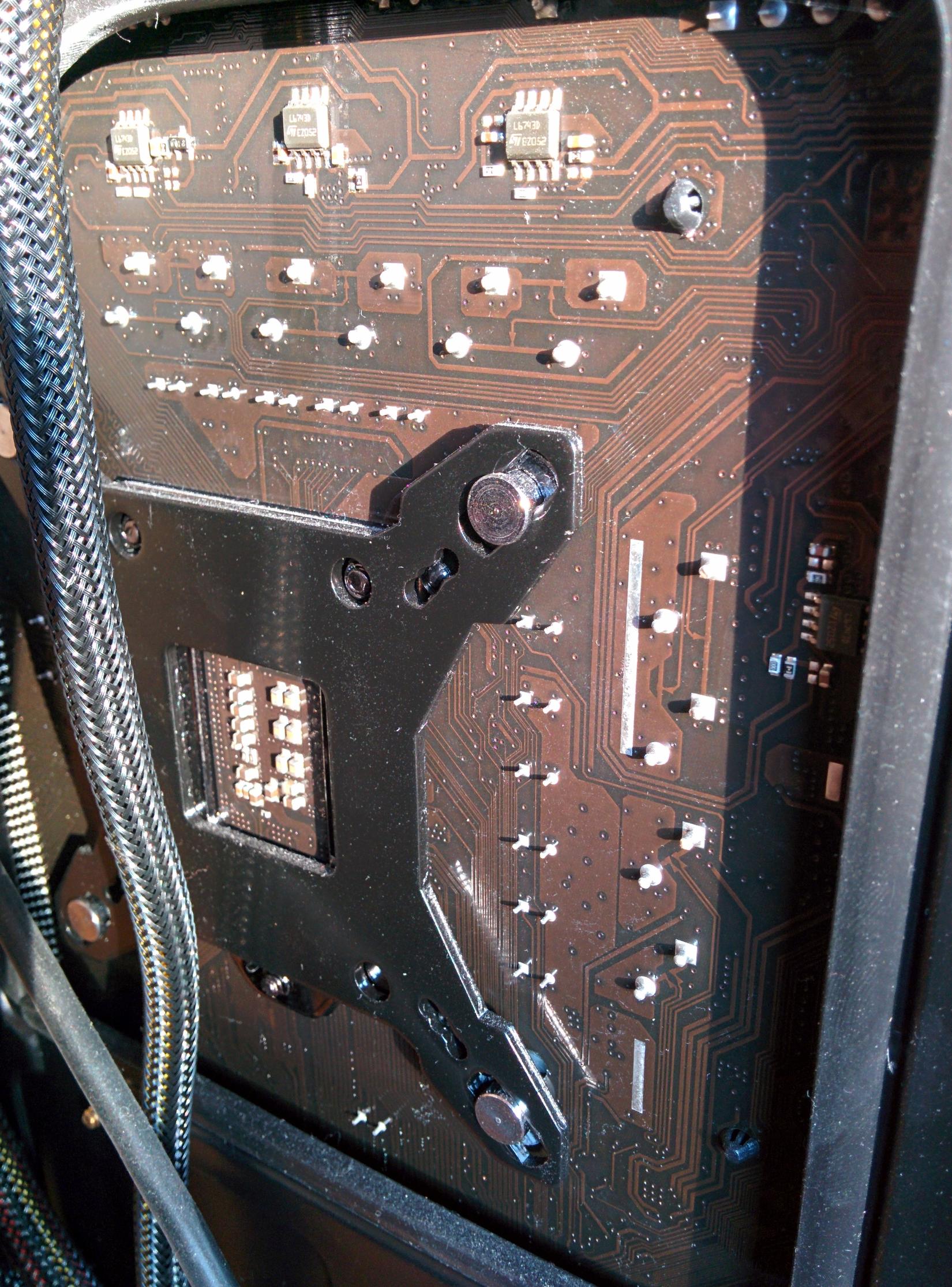 Wenn ich mir jedoch die Backplate des momentan verbauten Thermalright Ultra 120 anschaue, dann sieht das so aus, als könnte es mit anderen Backplates Probleme geben. Wie man auf dem Bild sieht, ist die X-förmige Backplate des zu ersetzenden Thermalright-Kühlers ziemlich schlank und spart die silbernen Kontakte (Rückseiten der Lötstellen?) an einem Punkt trotzdem nur gerade so aus. Ich habe noch keinen anderen Kühler getestet, aber wenn ich mir im Netz die Backplates der üblichen OC-Kühler so anschaue, dann erscheinen diese doch größer.